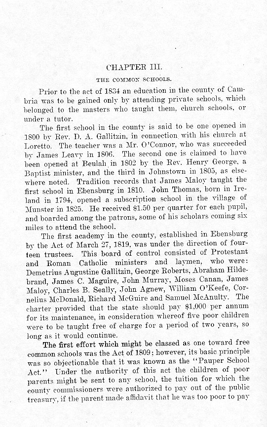 THE COMMON SCHOOLS Prior to the act of 1834 an education in the county of Cambria was to be gained only by attending private schools, which belonged to the masters who taught them, church schools or under a tutor. The first school in the county is said to be one opened in 1800 by Rev. D. A. Gallitzin, in connection with his church at Loretto. The teacher was a Mr. O'Connor, who was succeeded by James Leavy in 1806. The second one is claimed to have been opened at Beulah in 1802 by the Rev. Henry George, a Baptist minister, and the third in Johnstown in 1805, as elsewhere noted. Tradition records that James Maloy taught the first school in Ebensburg in 1810. John Thomas, born in Ireland in 1794, opened a subscription school in the village of Munster in 1825. He received $1.50 per quarter for each pupil and boarded among the patrons, some of his scholars coming six miles to attend the school. The first academy in the county, established in Ebensburg by the Act of March 27, 1819, was under the direction of fourteen trustees. This board of control consisted of Protestant and Roman Catholic ministers and laymen, who were: Demetrius Augustine Gallitzin, George Roberts, Abraham Hildebrand, James C. Maguire, John Murray, Moses Canan, James Maloy, Charles B. Seally, John Agnew, William O'Keefe, Cornelius McDonald, Richard McGuire and Samuel McAnulty. The charter provided that the state should pay $1,000 per annum for its maintenance, in consideration whereof five poor children were to be taught free of charge for a period of two years, so long as it would continue. The first effort which might be classed as one toward free common schools was the Act of 1809; however, its basic principle was so objectionable that it was known as the “Pauper School Act.” Under the authority of this act the children of poor parents might be sent to any school, the tuition for which the county commissioners were authorized to pay out of the public treasury, if the parent made affidavit that he was too poor to pay |
