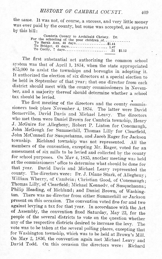 The first meeting of the directors and the county commissioners took place November 4, 1834. The latter were David Somerville, David Davis and Michael Leavy. The directors who met with them were Daniel Brown for Cambria township, Henry J. McGuire for Allegheny, Robert P. Linton for Conemaugh, John McGough for Summerhill, Thomas Lilly for Clearfield, John McConnell for Susquehanna, and Jacob Rager for Jackson township. Richland township was not represented. All the members of the convention, excepting Mr. Rager, voted for an assessment of six mills to be levied and collected by the county for school purposes. On May 4, 1835, another meeting was held at the commissioners' office to determine what should be done for that year. David Davis and Michael Leavy represented the county. The directors were: Dr. J. Duane Stark, of Allegheny; William Wherry, of Cambria; Christian Good, of Conemaugh; Thomas Lilly, of Clearfield; Michael Kennedy, of Susquehanna; Philip Heading, of Richland; and Daniel Brown, of Washington. There was no director from either Summerhill or Jackson present on this occasion. The convention voted five for and two against levying a tax for that year. In accordance with the Act of Assembly, the convention fixed Saturday, May 23, for the people of the several districts to vote on the question whether any of the respective districts desired to increase the levy. The vote was to be taken at the several polling places, excepting that for Washington township, which was to be held at Brown's Mill. On May 2, 1836, the convention again met Michael Leavy and David Todd. On this occasion the directors were: Richard