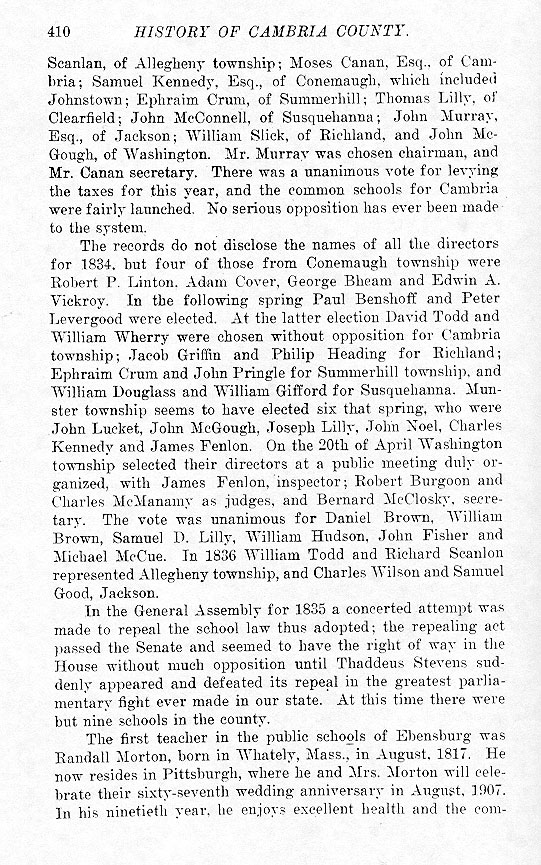 Scanlan, of Allegheny township; Moses Canan, Esq., of Cambria; Samuel Kennedy, Esq., of Conemaugh, which included Johnstown; Ephraim Crum, of Summerhill; Thomas Lilly, of Clearfield; John McConnell, of Susquehanna; John Murray, Esq., of Jackson; William Slick, of Richland, and John McGough, of Washington. Mr. Murray was chosen chairman, and Mr. Canan secretary. There was a unanimous vote for levying the taxes for this year, and the common schools for Cambria were fairly launched. No serious opposition has ever been made to the system. The records do not disclose the names of all the directors for 1834, but four of those from Conemaugh township were Robert P. Linton, Adam Cover, George Bheam and Edwin A. Vickroy. In the following spring Paul Benshoff and Peter Levergood were elected. At the latter election David Todd and William Wherry were chosen without opposition for Cambria township; Jacob Griffin and Philip Heading for Richland; Ephraim Crum and John Pringle for Summerhill township, and William Douglass and William Gifford for Susquehanna. Munster township seems to have elected six that spring, who were John Lucket, John McGough, Joseph Lilly, John Noel, Charles Kennedy and James Fenlon. On the 20th of April Washington township selected their directors at a public meeting duly organized, with James Fenlon, inspector; Robert Burgoon and Charles McManamy as judges, and Bernard McClosky, secretary. The vote was unanimous for Daniel Brown, William Brown, Samuel D. Lilly, William Hudson, John Fisher and Michael McCue. In 1836 William Todd and Richard Scanlon represented Allegheny township, and Charles Wilson and Samuel Good, Jackson. In the General Assembly for 1835 a concerted attempt was made to repeal the school law thus adopted; the repealing act passed the Senate and seemed to have the right of way in the House without much opposition until Thaddeus Stevens suddenly appeared and defeated its repeal in the greatest parliamentary fight ever made in our state. At this time there were but nine schools in the county. The first teacher in the public schools of Ebensburg was Randall Morton, born in Whately, Mass., in August, 1817. He now resides in Pittsburgh, where he and Mrs. Morton will celebrate their sixty-seventh wedding anniversary in August, 1907. In his ninetieth year, he enjoys excellent health and the com- |