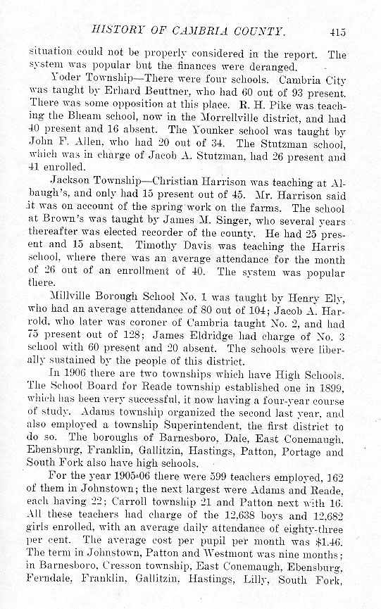 situation could not be properly considered in the report. The system was popular but the finances were deranged. Yoder Township—There were four schools. Cambria City was taught by Erhard Beuttner, who had 60 out of 93 percent. There was some opposition at this place. R. H. Pike was teaching the Bheam school, now in the Morrellville district, and had 40 present and 16 absent. The Younker school was taught by John F. Allen, who had 20 out of 34. The Stutzman school, which was in charge of Jacob A. Stutzman, had 26 present and 41 enrolled. Jackson Township—Christian Harrison was teaching at Albaugh's, and only had 15 present out of 45. Mr. Harrison said it was on account of the spring work on the farms. The school at Brown's was taught by James M. Singer, who several years thereafter was elected recorder of the county. He had 25 present and 15 absent. Timothy Davis was teaching the Harris school, where there was an average attendance for the month of 26 out of an enrollment of 40. The system was popular there. Millville Borough School No. 1 was taught by Henry Ely, who had an average attendance of 80 out of 104; Jacob A. Harold, who later was coroner of Cambria taught No. 2, and had 75 present out of 128; James Eldridge had charge of No. 3 school with 60 present and 20 absent. The schools were liberally sustained by the people of this district. In 1906 there are two townships which have High Schools. The School Board for Reade township established one in 1899, which has been very successful, it now having a four-year course of study. Adams township organized the second last year, and also employed a township Superintendent, the first district to do so. The boroughs of Barnesboro, Dale, East Conemaugh, Ebensburg, Franklin, Gallitzin, Hastings, Patton, Portage and South Fork also have high schools. For the year 1905-06 there were 599 teachers employed, 162 of them in Johnstown; the next largest were Adams and Reade, each having 22; Carroll township 21 and Patton next with 16. All these teachers had charge of the 12,638 boys and 12,682 girls enrolled, with an average daily attendance of eighty-three per cent. The average cost per pupil per month was $1.46. The term in Johnstown, Patton and Westmont was nine months; in Barnesboro, Cresson township, East Conemaugh, Ebensburg, Ferndale, Franklin, Gallitzin, Hastings, Lilly, South Fork, |