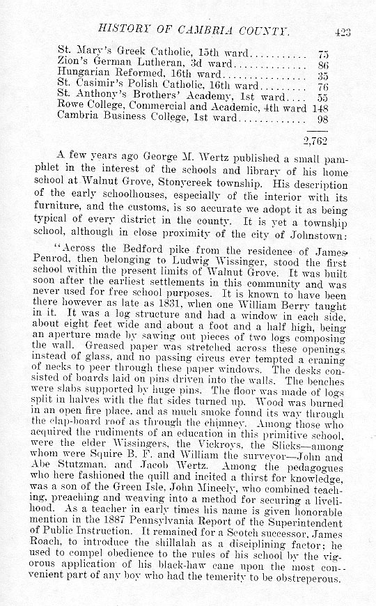 A few years ago George M. Wertz published a small pamphlet in the interest of the schools and library of his home school at Walnut Grove, Stonycreek township. His description of the early schoolhouses, especially of the interior with its furniture, and the customs, is so accurate we adopt it as being typical of every district in the county. It is yet a township school, although in close proximity of the city of Johnstown :