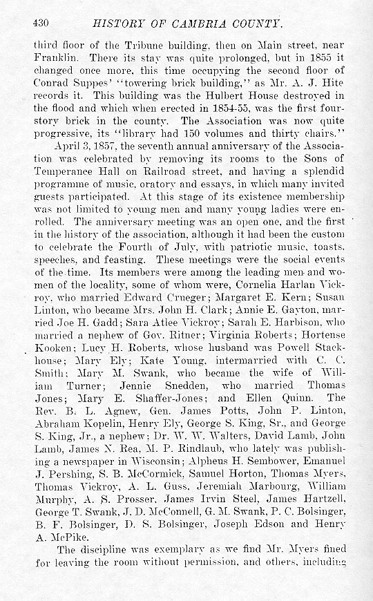 third floor of the Tribune building, then on Main street, near Franklin. There its stay was quite prolonged, but in 1855 it changed once more, this time occupying the second floor of Conrad Suppes' “towering brick building,” as Mr. A. J. Hite records it. This building was the Hulbert House destroyed in the flood and which when erected in 1854-55, was the first four-story brick in the county. The Association was now quite progressive, its “library had 150 volumes and thirty chairs.” April 3, 1857, the seventh annual anniversary of the Association was celebrated by removing its rooms to the Sons of Temperance Hall on Railroad street, and having a splendid programme of music, oratory and essays, in which many invited guests participated. At this stage of its existence membership was not limited to young men and many young ladies were enrolled. The anniversary meeting was an open one, and the first in the history of the association, although it had been the custom to celebrate the Fourth of July, with patriotic music, toasts, speeches, and feasting. These meetings were the social events of the time. Its members were among the leading men and women of the locality, some of whom were, Cornelia Harlan Vickroy, who married Edward Crueger ; Margaret E. Kern ; Susan Linton, who became Mrs. John H. Clark ; Annie E. Gayton, married Joe H. Gadd ; Sara Atlee Vickroy ; Sarah E. Harbison, who married a nephew of Gov. Ritner ; Virginia Roberts ; Hortense Kooken ; Lucy H. Roberts, whose husband was Powell Stackhouse ; Mary Ely ; Kate Young, intermarried with C. C. Smith ; Mary M. Swank, who became the wife of William Turner ; Jennie Snedden, who married Thomas Jones ; Mary E. Shaffer-Jones ; and Ellen Quinn. The Rev. B. L. Agnew, Gen. James Potts, John P. Linton, Abraham Kopelin, Henry Ely, George S. King, Sr., and George S. King, Jr., a nephew ; Dr. W. W. Walters, David Lamb, John Lamb, James N. Rea, M. P. Rindlaub, who lately was publishing a newspaper in Wisconsin ; Alpheus H. Sembower, Emanuel J. Pershing, S. B. McCormick, Samuel Horton, Thomas Myers, Thomas Vickroy, A. L. Guss, Jeremiah Marbourg, William Murphy, A. S. Prosser, James Irvin Steel, James Hartzell, George T. Swank, J. D. McConnell, G. M. Swank, P. C. Bolsinger, B. F. Bolsinger, D. S. Bolsinger, Joseph Edson and Henry A. McPike. The discipline was exemplary as we find Mr. Myers fined for leaving the room without permission, and others, including |