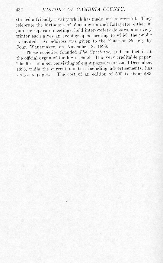 These societies founded The Spectator, and conduct it as the official organ of the high school. It is very creditable paper. The first number, consisting of eight pages, was issued December, 1898, while the current number, including advertisements, has sixty-six pages. The cost of an edition of 500 is about $85.