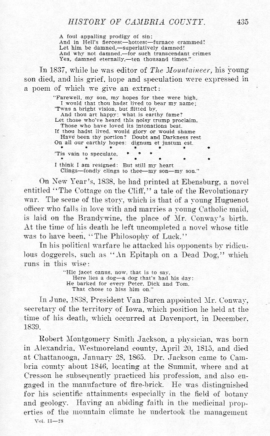 In June, 1838, President Van Buren appointed Mr. Conway, secretary of the territory of Iowa, which position he held at the time of his death, which occurred at Davenport, in December, 1839. Robert Montgomery Smith Jackson, a physician, was born in Alexandria, Westmoreland county, April 20, 1815, and died at Chattanooga, January 28, 1865, Dr. Jackson came to Cambria county about 1846, locating at the Summit, where and at Cresson he subsequently practiced his profession, and also engaged in the manufacture of fire-brick. He was distinguished for his scientific attainments especially in the field of botany and geology. Having an abiding faith in the medicinal properties of the mountain climate he undertook the management |
