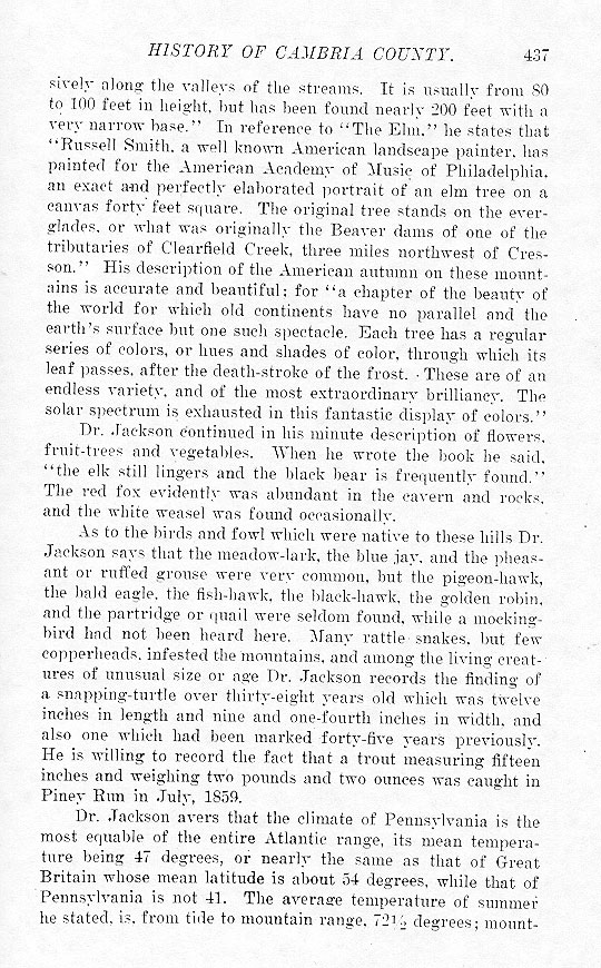 sively along the valleys of the streams. It is usually from 80 to 100 feet in height, but has been found nearly 200 feet with a very narrow base.” In reference to the “The Elm,” he states that “Russell Smith, a well known American landscape painter, has painted for the American Academy of Music of Philadelphia, an exact and perfectly elaborated portrait of an elm tree on a canvas forty feet square. The original tree stands on the everglades, or what was originally the Beaver dams of one of the tributaries of Clearfield Creek, three miles northwest of Cresson.” His description of the American autumn on these mountains is accurate and beautiful: for “a chapter of the beauty of the world for which old continents have no parallel and the earth's surface but one such spectacle. Each tree has a regular series of colors, or hues and shades of color, through which its leaf passes, after the death-stroke of the frost. These are of an endless variety, and of the most extraordinary brilliancy. The solar spectrum is exhausted in this fantastic display of colors.” Dr. Jackson continued in his minute description of flowers, fruit-trees and vegetables. When he wrote the book he said, “the elk still lingers and the black bear is frequently found.” The red fox evidently was abundant in the cavern and rocks, and the white weasel was found occasionally. As to the birds and fowl which were native to these hills Dr. Jackson says that the meadow-lark, the blue jay, and the pheasant or ruffed grouse were very common, but the pigeon-hawk, the bald eagle, the fish-hawk, the black-hawk, the golden robin, and the partridge or quail were seldom found, while a mockingbird had not been heard here. Many rattle snakes, but few copperheads, infested the mountains, and among the living creatures of unusual size or age Dr. Jackson records the finding of a snapping-turtle over thirty-eight years old which was twelve inches in length and nine and one-fourth inches in width, and also one which had been marked forty-five years previously. He is willing to record the fact that a trout measuring fifteen inches and weighing two pounds and two ounces was caught in Piney Run in July, 1859. Dr. Jackson avers that the climate of Pennsylvania is the most equable of the entire Atlantic range, its mean temperature being 47 degrees, or nearly the same as that of Great Britain whose mean latitude is about 54 degrees, while that of Pennsylvania is not 41. The average temperature of summer he stated, is, from tide to mountain range, 72 ½ degrees; mount- |