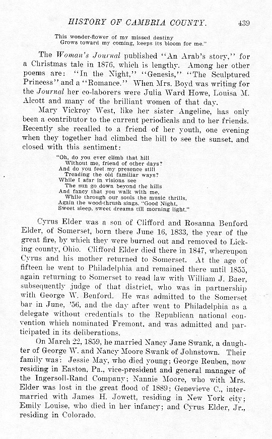 Cyrus Elder was a son of Clifford and Rosanna Benford Elder, of Somerset, born there June 16, 1833, the year of the great fire, by which they were burned out and removed to Licking county Ohio. Clifford Elder died there in 1847, whereupon Cyrus and his mother returned to Somerset. At the age of fifteen he went to Philadelphia and remained there until 1855, again returning to Somerset to read law with William J. Baer, subsequently judge of that district, who was in partnership with George W. Benford. He was admitted to the Somerset bar in June, '56, and the day after went to Philadelphia as a delegate without credentials to the Republican national convention which nominated Fremont, and was admitted and participated in its deliberations. On March 22, 1859, he married Nancy Jane Swank, a daughter of George W. and Nancy Moore Swank of Johnstown. Their family was: Jessie May, who died young; George Reuben, now residing in Easton, Pa., vice-president and general manager of the Ingersoll-Rand Company; Nannie Moore, who with Mrs. Elder was lost in the great flood of 1889; Genevieve C., intermarried with James H. Jowett, residing in New York city; Emily Louise, who died in her infancy; and Cyrus Elder, Jr., residing in Colorado. |