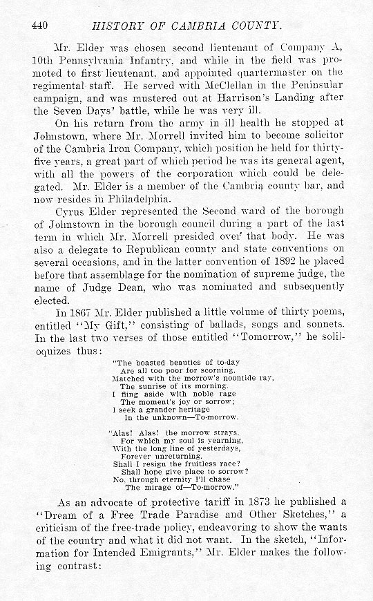 Mr. Elder was chosen second lieutenant of Company A, 10th Pennsylvania Infantry, and while in the field was promoted to first lieutenant, and appointed quartermaster on the regimental staff. He served with McClellan in the Peninsular campaign, and was mustered out at Harrison's Landing after the Seven Days' battle, while he was very ill. On his return from the army in ill health he stopped at Johnstown, where Mr. Morrell invited him to become solicitor of the Cambria Iron Company, which position he held for thirty-five years, a great part of which period he was its general agent, with all the powers of the corporation which could be delegated. Mr. Elder is a member of the Cambria county bar, and now resides in Philadelphia. Cyrus Elder represented the Second ward of the borough of Johnstown in the borough council during a part of the last term in which Mr. Morrell presided over that body. He was also a delegate to Republican county and state conventions on several occasions, and in the latter convention of 1892 he placed before that assemblage for the nomination of supreme judge, the name of Judge Dean, who was nominated and subsequently elected. In 1867 Mr. Elder published a little volume of thirty poems, entitled “My Gift,” consisting of ballads, songs and sonnets. In the last two verses of those entitled “Tomorrow,” he soliloquizes thus: