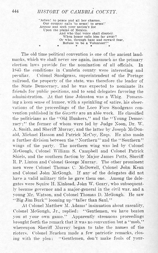 The old time political convention is one of the ancient landmarks, which we shall never see again, inasmuch as the primary election laws provide for the nomination of all officials. In 1845 the conditions in Cambria county were interesting and peculiar. Colonel Snodgrass, superintendent of the portage railroad, the property of the state, was therefore the leader of the State Democracy, and he was expected to nominate its friends for public positions, and to send delegates favoring the administration. At that time Johnston was a Whig. Possessing a keen sense of humor, with a sprinkling of satire, his observations of the proceedings of the Loco Foco Snodgrass convention published in the Gazette are an able work. He classified the politicians as the “Old Hunkers,” and the “Young Democracy.” the former of whom were led by Judge Noon, Dr. W. A. Smith, and Sheriff Murray, and the latter by Joseph McDonald, Michael Hasson and Patrick McCoy, Esqs. He also made a further division between the “Northern” and the “Southern” wings of the party. The northern wing was led by Colonel McGough, Colonel William S. Campbell and Colonel Patrick Shiels, and the southern faction by Major James Potts, Sheriff R. P. Linton and Colonel George Murray. The other prominent men were Colonel Thomas C. McDowell, Colonel John Kean and Colonel John McGough. If any of the delegates did not have a valid military title he gave them one. Among the delegates were Squire H. Kinkead, John W. Geary, who subsequently became governor and a major-general in the civil war, and a young Mr. Watson, and Colonel Thomas D. McGough. He saw “Big Jim Burk” looming up “taller than Saul.”