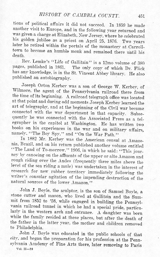 tions of political affairs it did not succeed. In 1859 he made another visit to Europe, and in the following year returned and was given a charge at Elizabeth, New Jersey, where he celebrated his golden jubilee as a priest on April 25, 1876. Two years later he retired within the portals of the monastery at Carrolltown to become an humble monk and remained there until his death. Rev. Lemke's “Life of Gallitzin” is a 12mo volume of 380 pages, published in 1861. The only copy of which Dr. Flick has any knowledge, is in the St. Vincent Abbey library. He also published an autobiography. Joseph Orton Kerbey was a son of George W. Kerbey, of Wilmore, the agent of the Pennsylvania railroad there from the time of its beginning. A railroad telegraph office was located at that point and during odd moments Joseph Kerbey learned the art of telegraphy, and at the beginning of the Civil war became connected with the war department in that capacity. Subsequently he was connected with the Associated Press as a telegrapher in the capitol at Washington. He has written two books on his experiences in the war and on military affairs, namely, “The Boy Spy,” and “On the War Path.” In 1882 Mr. Kerbey was the American consul at Amazonia, Brazil, and on his return published another volume entitled “The Land of Tomorrow,” 1906, in which he said: “This journey by canoeing on the affluents of the upper or alto Amazon and rough riding over the Andes (frequently three miles above the level of the sea riding a mule) was undertaken in the interest of research for new rubber territory immediately following the writer's consular agitation of the impending destruction of the natural sources of the lower Amazon.” John J. Boyle, the sculptor, is the son of Samuel Boyle, a stone cutter and mason, who lived at Gallitzin and the Summit from 1852 to '58, while engaged in building the Pennsylvania railroad tunnel in which he had a special pride, particularly in the western arch and entrance. A daughter was born while the family resided at these places, but after the death of the father in the latter year, the mother and children removed to Philadelphia. John J. Boyle was educated in the public schools of that city, and began the preparation for his profession at the Pennsylvania Academy of Fine Arts there, later removing to Paris |