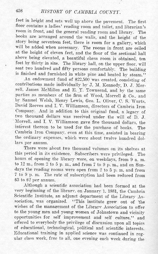 feet in height and sets well up above the pavement. The first floor contains a ladies' reading room and toilet, and librarian's room in front, and the general reading room and library. The books are arranged around the walls, and the height of the story being seventeen feet there is room for a gallery, which will be added when necessary. The rooms in front are ceiled at the height of eleven feet, and the floor of the sectional hall above being elevated, a beautiful chess room is obtained, ten feet by thirty in size. The library hall, on the upper floor, will seat two hundred and fifty persons comfortably. The building is finished and furnished in white pine and heated by steam.” An endowment fund of $22,500 was created, consisting of contributions made individually by J. M. Kennedy, D. J. Morrell, James McMillen and E. Y. Townsend, and by the same parties as members of the firm of Wood, Morrell & Co., and by Samuel Welsh, Henry Lewis, Geo. L. Oliver, C. S. Wurts, David Reeves and I. V. Williamson, directors of Cambria Iron Company, and in addition to this original fund, a legacy of two thousand dollars was received under the will of D. J. Morrell, and I. V. Williamson gave five thousand dollars, the interest thereon to be used for the purchase of books. The Cambria Iron Company, even at this time, assisted in bearing the ordinary expenses, which were about twelve hundred dollars per annum. There were about two thousand volumes on its shelves at this period in its existence. Subscribers were privileged. The hours of opening the library were, on weekdays, from 9 a.m. to 12 m., from 2 to 5 p.m., and from 7 to 9 p.m., and on Sundays, the reading rooms were open from 2 to 5 p.m., and from 7 to 9 p.m. The rate of subscription had been reduced from $3 to $2 per annum. Although a scientific association had been formed at the very beginning of the library, on January 1, 1881, the Cambria Scientific Institute, an adjunct department of the Library Association, was organized. “This institute grew out of the wishes of the management of the Library Association to offer to the young men and young women of Johnstown and vicinity opportunities for self improvement and self culture,” and offered to everybody the privilege of discussion upon all topics of educational, technological, politician and scientific interests. Educational training in applied science was continued in regular class work, free to all, one evening each week during the |