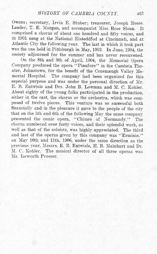 On the 8th and 9th of April, 1904, the Memorial Opera Company produced the opera “Pinafore” in the Cambria Theater, Johnstown, for the benefit of the Conemaugh Valley Memorial Hospital. The company had been organized for this especial purpose and was under the personal direction of Mr. E. B. Entwisle and Drs. John B. Lowman and M. C. Kohler. About eighty of the young folks participated in the production, either in the cast, the chorus or the orchestra, which was composed of twelve pieces. This venture was so successful both financially and in the pleasure it gave to the people of the city that on the 5th and 6th of the following May the same company presented the comic opera, “Chimes of Normandy.” The chorus numbered over forty voices, and their splendid work, as well as that of the soloists, was highly appreciated. The third and last of the operas given by this company was “Erminie,” on May 10th and 11th, 1906, under the same direction as the previous year, Messrs. E. B. Entwisle, H. B. Mainhart and Dr. M. C. Kohler. The musical director of all three operas was Mr. Iorworth Prosser.
