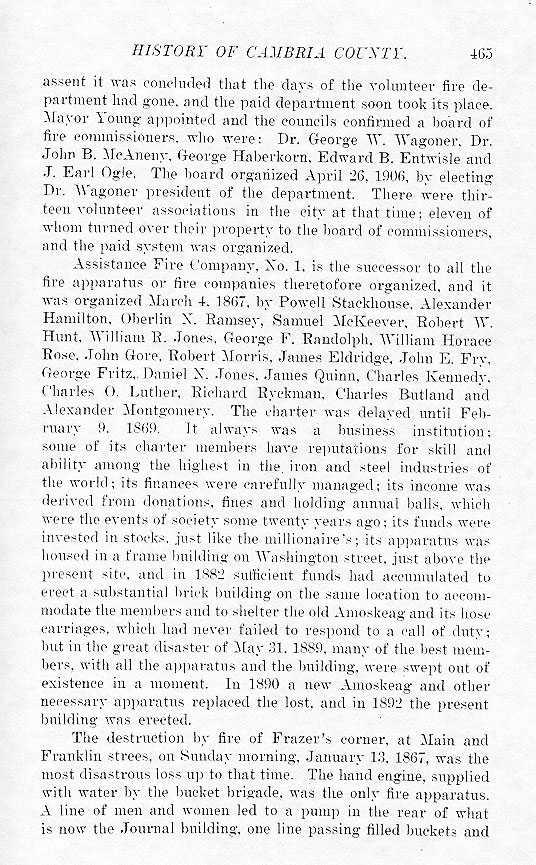 assent it was concluded that the days of the volunteer fire department had gone, and the paid department soon took its place. Mayor Young appointed and the councils confirmed a board of fire commissioners, who were: Dr. George W. Wagoner, Dr. John B. McAneny, George Haberkorn, Edward B. Entwisle and J. Earl Ogle. The board organized April 26, 1906, by electing Dr. Wagoner president of the department. There were thirteen volunteer associations in the city at that time; eleven of whom turned over their property to the board of commissioners, and the paid system was organized. Assistance Fire Company, No. 1, is the successor to all the fire apparatus or fire companies, theretofore organized, and it was organized March 4, 1867, by Powell Stackhouse, Alexander Hamilton, Oberlin N. Ramsey, Samuel McKeever, Robert W. Hunt, William R. Jones, George F. Randolph, William Horace Rose, John Gore, Robert Morris, James Eldridge, John E. Fry, George Fritz, Daniel N. Jones, James Quinn, Charles Kennedy, Charles O. Luther, Richard Ryckman, Charles Butland and Alexander Montgomery. The charter was delayed until February 9, 1869. It always was a business institution; some of its charter members have reputations for skill and ability among the highest in the iron and steel industries of the world; its finances were carefully managed; its income was derived from donations, fines and holding annual balls, which were the events of society some twenty years ago; its funds were invested in stocks, just like the millionaire's; its apparatus was housed in a frame building on Washington street, just above the present site, and in 1882 sufficient funds had accumulated to erect a substantial brick building on the same location to accommodate the members and to shelter the old Amoskeag and its hose carriages, which had never failed to respond to a call of duty; but in the great disaster of May 31, 1889, many of the best members, with all the apparatus and the building, were swept out of existence in a moment. In 1890 a new Amoskeag and other necessary apparatus replaced the lost, and in 1892 the present building was erected. The destruction by fire of Frazer's corner, at Main and Franklin strees, on Sunday morning, January 13, 1867, was the most disastrous loss up to that time. The hand engine, supplied with water by the bucket brigade, was the only fire apparatus. A line of men and women led to a pump in the rear of what is now the Journal building, one line passing filled buckets and |
