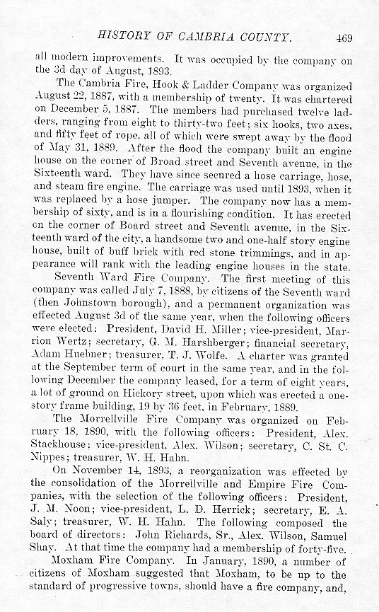 all modern improvements. It was occupied by the company on the 3d day of august, 1893. The Cambria Fire, Hook & Ladder Company was organized August 22, 1887, with a membership of twenty. It was chartered on December 5, 1887. The members had purchased twelve ladders, ranging from eight to thirty-two feet; six hooks, two axes, and fifty feet of rope, all of which were swept away by the flood of May 31, 1889. After the flood the company built an engine house on the corner of Broad street and Seventh avenue, in the Sixteenth ward. They have since secured a hose carriage, hose, and steam fire engine. The carriage was used until 1893, when it was replaced by a hose jumper. The company now has a membership of sixty, and is in a flourishing condition. It has erected on the corner of Broad street and Seventh avenue, in the Sixteenth ward of the city, a handsome two and one-half story engine house, built of buff brick with red stone trimmings, and in appearance will rank with the leading engine houses in the state. Seventh Ward Fire Company. The first meeting of this company was called July 7, 1888, by citizens of Seventh ward (then Johnstown borough), and a permanent organization was effected August 3d of the same year, when the following officers were elected: President, David H. Miller; vice-president, Marrion Wertz; secretary, G. M. Harshberger; financial secretary, Adam Huebner; treasurer, T. J. Wolfe. A charter was granted at the September term of the court in the same year, and in the following December the company leased, for a term of eight years, a lot of ground on Hickory street, upon which was erected a one-story frame building, 19 x 36 feet, in February, 1889. The Morrellville Fire company was organized on February 18, 1890, with the following officers: President, Alex. Stackhouse; vice-president, Alex. Wilson; secretary, C. St. C. Nippes; treasurer, W. H. Hahn. On November 14, 1893, a reorganization was effected by the consolidation of the Morrellville and Empire Fire Companies, with the selection of the following officers: President, J. M. Noon; vice-president, L. D. Herrick; secretary, E. A. Saly; treasurer, W. H. Hahn. The following composed the board of directors: John Richards, Sr., Alex. Wilson, Samuel Shay. At that time the company had a membership of forty-five. Moxham Fire Company. In January, 1890, a number of citizens of Moxham suggested that Moxham, to be up to the standard of progressive towns, should have a fire company, and, |