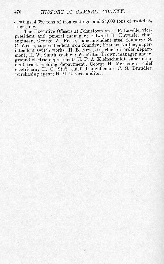 The Executive Offices at Johnstown are: P. Lavelle, vice-president and general manager; Edward B. Entwisle, chief engineer; George W. Reese, superintendent steel foundry; S. C. Weeks, superintendent iron foundry; Francis Nather, superintendent switch works; H. B. Frye, Jr., chief of order department; H. W. Smith, cashier; W. Milton Brown, manager underground electric department; H. F. A. Kleinschmidt, superintendent track welding department; George H. McFeaters, chief electrician; H. C. Stiff, chief draughtsman; C. S. Brandler, purchasing agent; H. M. Davies, auditor.