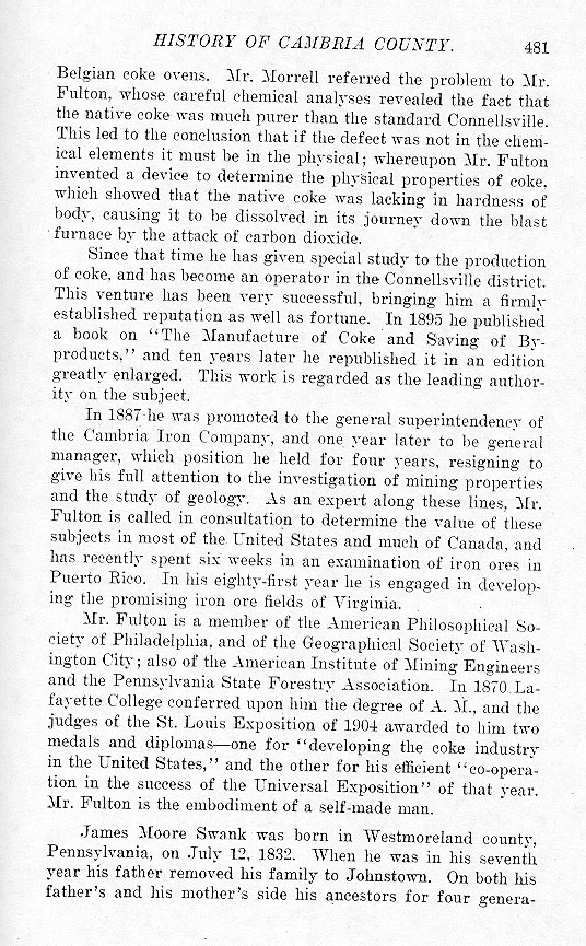 Belgian coke ovens. Mr. Morrell referred the problem to Mr. Fulton, whose careful chemical analyses revealed the fact that the native coke was much purer than the standard Connellsville. This led to the conclusion that if the defect was not in the chemical elements it must be in the physical; whereupon Mr. Fulton invented a device to determine the physical properties of coke, which showed that the native coke was lacking in hardness of body, causing it to be dissolved in its journey down the blast furnace by the attack of carbon dioxide. Since that time he has given special study to the production of coke, and has become an operator in the Connellsville district. This venture has been very successful, bringing him a firmly established reputation as well as fortune. In 1895 he published a book on "The Manufacture of Coke and Saving of By-products," and ten years later he republished it in an edition greatly enlarged. This work is regarded as the leading authority on the subject. In 1887 he was promoted to the general superintendency of the Cambria Iron Company, and one year later to be general manager, which position he held for four years, resigning to give his full attention to the investigation of mining properties and the study of geology. As an expert along these lines, Mr. Fulton is called in consultation to determine the value of these subjects in most of the United States and much of Canada, and has recently spent six weeks in an examination of iron ores in Puerto Rico. In his eighty-first year he is engaged in developing the promising iron ore fields of Virginia. Mr. Fulton is a member of the American Philosophical Society of Philadelphia, and of the Geographical Society of Washington City; also of the American Institute of Mining Engineers and the Pennsylvania State Forestry Association. In 1870 Lafayette College conferred upon him the degree of A. M., and the judges of the St. Louis Exposition of 1904 awarded to him two medals and diplomas--one for "developing the coke industry in the United States," and the other for his efficient "co-operation in the success of the Universal Exposition" of that year. Mr. Fulton is the embodiment of a self-made man. James Moore Swank was born in Westmoreland county, Pennsylvania, on July 12, 1832. When he was in his seventh year his father removed his family to Johnstown. On both his father's and his mother's side his ancestors for four genera- |