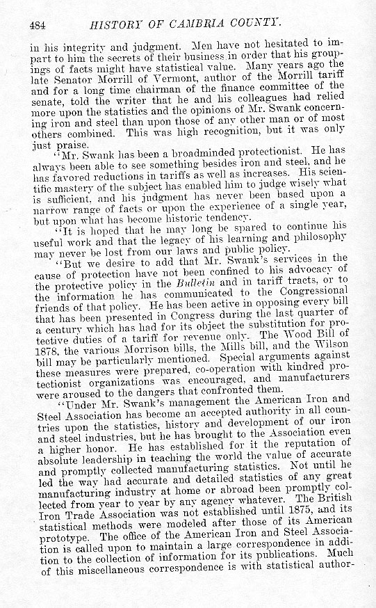 in his integrity and judgment. Men have not hesitated to impart to him the secrets of their business in order that his groupings of facts might have statistical value. Many years ago the late Senator Morrill of Vermont, author of the Morrill tariff and for a long time chairman of the finance committee of the senate, told the writer that he and his colleagues had relied more upon the statistics and the opinions of Mr. Swank concerning iron and steel than upon those of any other man or of most others combined. This was high recognition, but it was only just praise. "Mr. Swank has been a broadminded protectionist. He has always been able to see something besides iron and steel, and he has favored reductions in tariffs as well as increases. His scientific mastery of the subject has enabled him to judge wisely what is sufficient, and his judgment has never been based upon a narrow range of facts or upon the experience of a single year, but upon what has become historic tendency. "It is hoped that he may long be spared to continue his useful work and that the legacy of his learning and philosophy may never be lost from our laws and public policy. "But we desire to add that Mr. Swank's services in the cause of protection have not been confined to his advocacy of the protective policy in the Bulletin and in tariff tracts, or to the information he has communicated to the Congressional friends of that policy. He has been active in opposing every bill that has been presented in Congress during the last quarter of a century which has had for its object the substitution for protective duties of a tariff for revenue only. The Wood Bill of 1878, the various Morrison bills, the Mills bill, and the Wilson bill may be particularly mentioned. Special arguments against these measures were prepared, co-operation with kindred protectionist organizations was encouraged, and manufacturers were aroused to the dangers that confronted them. "Under Mr. Swank's management the American Iron and Steel Association has become an accepted authority in all countries upon the statistics, history and development of our iron and steel industries, but he has brought to the Association even a higher honor. He has established for it the reputation of absolute leadership in teaching the world the value of accurate and promptly collected manufacturing statistics. Not until he led the way had accurate and detailed statistics of any great manufacturing industry at home or abroad been promptly collected from year to year by any agency whatever. The British Iron Trade Association was not established until 1875, and its statistical methods were modeled after those of its American prototype. The office of the American Iron and Steel Association is called upon to maintain a large correspondence in addition to the collection of information for its publications. Much of this miscellaneous correspondence is with statistical author- |