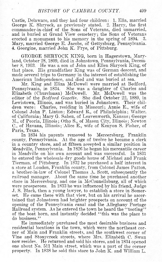 Castle, Delaware, and they had four children: 1. Ella, married George K. Shryock, as previously stated. 2. Harry, the first commander-in-chief of the Sons of Veterans, died unmarried, and is buried at Grand View cemetery; the Sons of Veterans erected a monument to his memory in the spring of 1894. 3. Mary, married George E. Jacobs, of Gettysburg, Pennsylvania. 4. Georgine, married John K. Frye, of Pittsburg. GEORGE SHRYOCK KING, born in Hagerstown, Maryland, October 28, 1809, died in Johnstown, Pennsylvania, December 8, 1903. He was a son of John and Ellen Shryock King, of that place. His grandfather King was of German descent, and made several trips to Germany in the interest of establishing the American Independence, and died and was buried at sea. Mr. King and Eliza McDowell were married at Bedford, Pennsylvania, in 1834. She was a daughter of Charles and Elizabeth (Churchman) McDowell. Mr. McDowell was the editor of the Bedford Gazette. She died October 22, 1889, in Lewistown, Illinois, and was buried in Johnstown. Their children were: Charles, residing in Missouri; Annie E., wife of Colonel John P. Linton; Edward R., of Philadelphia; Walter, of California; Mary G. Saben, of Leavenworth, Kansas; George M., of Peoria, Illinois; Otho S., of Mason City, Illinois; Newton C., of Havana, Illinois; Alice E., wife of Kenyon S. Fisher, of Paris, Texas. In 1834 his parents removed to Mercersburg, Franklin county, Pennsylvania. At the age of twelve he became a clerk in a country store, and at fifteen accepted a similar position in Meadville, Pennsylvania. In 1826 he began his mercantile career in Meadville on his own account and was successful. In 1831 he entered the wholesale dry goods house of Michael and Frank Tierman, of Pittsburg. In 1832 he purchased a half interest in a store at Loudon, Franklin county, from Colonel James Patton, a brother-in-law of Colonel Thomas A. Scott, subsequently the railroad manager. About the same time he purchased another store in Mercersburg, and one in McConnellsburg, all of which were prosperous. In 1833 he was influenced by his friend, Judge J. S. Black, then a young lawyer, to establish a store in Somerset. He came there with that view, but on his arrival he ascertained that Johnstown had brighter prospects on account of the opening of the Pennsylvania canal and the Allegheny Portage Railroad system. As he entered the town he heard the “tooting” of the boat horn, and instantly decided “this was the place to do business.” He immediately purchased the most desirable business and residential locations in the town, which were the northeast corner of Main and Franklin streets, and the southwest corner of Vine and Stonycreek streets, where Mrs. Elizabeth C. Swan now resides. He returned and sold his stores, and in 1834 opened one about No. 511 Main street, which was a part of the corner property. In 1838 he sold this store to John K. and William L. |
