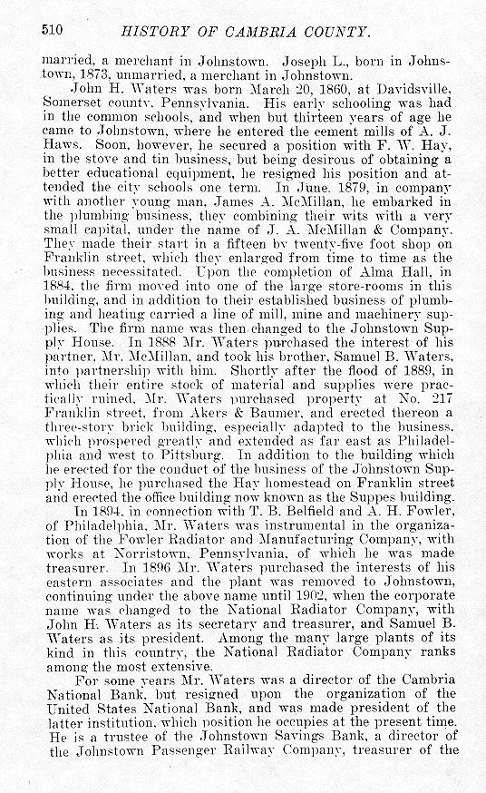 married, a merchant in Johnstown. Joseph L., born in Johnstown, 1873, unmarried, a merchant in Johnstown. John H. Waters was born March 20, 1860, at Davidsville, Somerset county, Pennsylvania. His early schooling was had in the common schools, and when but thirteen years of age he came to Johnstown, where he entered the cement mills of A. J. Haws. Soon, however, he secured a position with F. W. Hay, in the stove and tin business, but being desirous of obtaining a better educational equipment, he resigned his position and attended the city schools one term. In June, 1879, in company with another young man, James A. McMillan, he embarked in the plumbing business, they combining their wits with a very small capital, under the name of J. A. McMillan & Company. They made their start in a fifteen by twenty-five shop on Franklin street, which they enlarged from time to time as the business necessitated. Upon the completion of Alma Hall, in 1884, the firm moved into one of the large store-rooms in this building, and in addition to their established business of plumbing and heating carried a line of mill, mine and machinery supplies. The firm name was then changed to the Johnstown Supply House. In 1888 Mr. Waters purchased the interest of his partner, Mr. McMillan, and took his brother, Samuel B. Waters, into partnership with him. Shortly after the flood of 1889, in which their entire stock of material and supplies were practically ruined, Mr. Waters purchased property at No. 217 Franklin street, from Akers & Baumer, and erected thereon a three-story brick building, especially adapted to the business, which prospered greatly and extended as far east as Philadelphia and west to Pittsburg. In addition to the building which he erected for the conduct of the business of the Johnstown Supply House, he purchased the Hay homestead on Franklin street and erected the office building now known as the Suppes building. In 1894, in connection with T. B. Belfield and A. H. Fowler, of Philadelphia, Mr. Waters was instrumental in the organization of the Fowler Radiator and Manufacturing Company, with works at Norristown, Pennsylvania, of which he was made treasurer. In 1896 Mr. Waters purchased the interests of his eastern associates and the plant was removed to Johnstown, continuing under the above name until 1902, when the corporate name was changed to the National Radiator Company, with John H. Waters as its secretary and treasurer, and Samuel B. Waters as its president. Among the many large plants of its kind in this country, the National Radiator Company ranks among the most extensive. For some years Mr. Waters was a director of the Cambria National Bank, but resigned upon the organization of the United States National Bank, and was made president of the latter institution, which position he occupies at the present time. He is a trustee of the Johnstown Savings Bank, a director of the Johnstown Passenger Railway Company, treasurer of the |