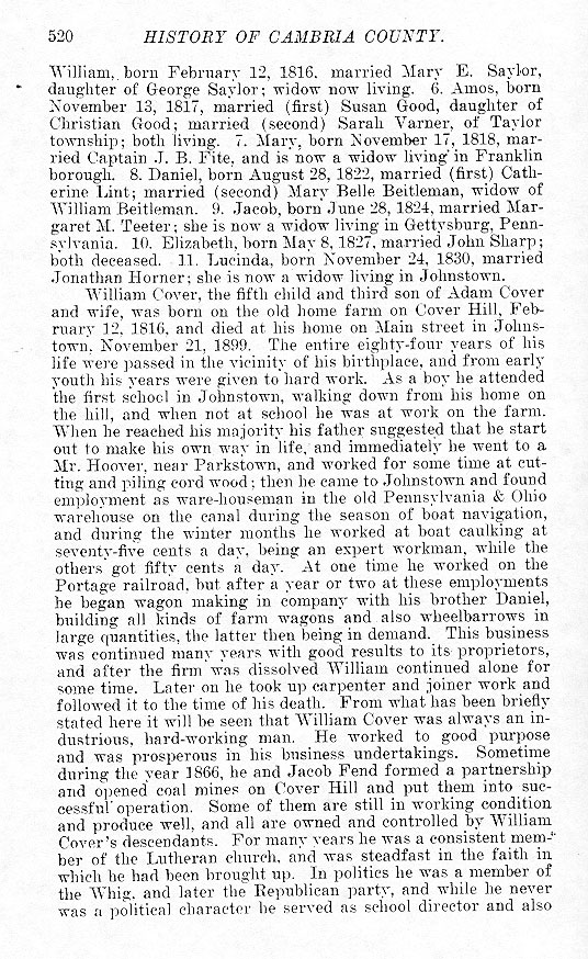 William Cover, the fifth child and third son of Adam Cover and wife, was born on the old home farm on Cover Hill, February 12, 1816, and died at his home on Main street in Johnstown, November 21, 1899. The entire eighty-four years of his life were passed in the vicinity of his birthplace. and from early youth his years were given to hard work. As a boy he attended the first school in Johnstown, walking down from his home on the hill, and when not at school he was at work on the farm. When he reached his majority his father suggested that he start out to make his own way in life, and immediately he went to a Mr. Hoover, near Parkstown, and worked for some time at cutting and piling cord wood; then he came to Johnstown and found employment as ware-houseman in the old Pennsylvania & Ohio warehouse on the canal during the season of boat navigation, and during the winter months he worked at boat caulking at seventy-five cents a day, being an expert workman, while the others got fifty cents a day. At one time he worked on the Portage railroad, but after a year or two at these employments he began wagon making in company with his brother Daniel, building all kinds of farm wagons and also wheelbarrows in large quantities, the latter then being in demand. This business was continued many years with good results to its proprietors, and after the firm was dissolved William continued alone for some time. Later on he took up carpenter and joiner work and followed it to the time of his death. From what has been briefly stated here it will be seen that William Cover was always an industrious, hard-working man. He worked to good purpose and was prosperous in his business undertakings. Sometime during the year 1866, he and Jacob Fend formed a partnership and opened coal mines on Cover Hill and put them into successful operation. Some of then are still in working condition and produce well, and all are owned and controlled by William Cover's descendants. For many years he was a consistent member of the Lutheran church, and was steadfast in the faith in which he had been brought up. In politics he was a member of the Whig, and later the Republican Party and while he never was a political character he served as school director and also
