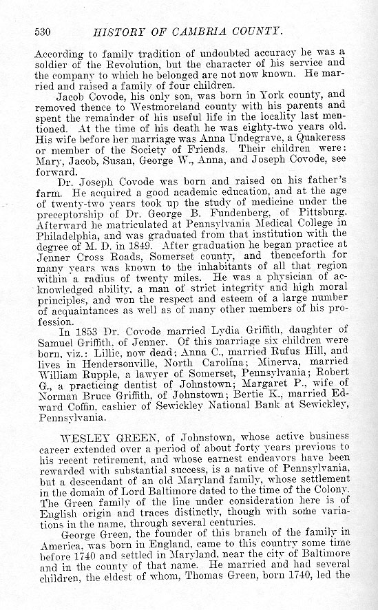 According to family tradition of undoubted accuracy he was a soldier of the Revolution, but the character of his service and the company to which he belonged are not now known. He married and raised a family of four children. Jacob Covode, his only son, was born in York county, and removed thence to Westmoreland county with his parents and spent the remainder of his useful life in the locality last mentioned. At the time of his death he was eighty-two years old. His wife before her marriage was Anna Undegrave, a Quakeress or member of the Society of Friends. Their children were: Mary, Jacob, Susan, George W., Anna, and Joseph Covode, see forward. Dr. Joseph Covode was born and raised on his father's farm. He acquired a good academic education, and at the age of twenty-two years took up the study of medicine under the preceptorship of Dr. George B. Fundenberg, of Pittsburg. Afterward he matriculated at Pennsylvania Medical College in Philadelphia, and was graduated from that institution with the degree of M. D. in 1849. After graduation he began practice at Jenner Cross Roads, Somerset county, and thenceforth for many years was known to the inhabitants of all that region within a radius of twenty miles. He was a physician of acknowledged ability, a man of strict integrity and high moral principles, and won the respect and esteem of a large number of acquaintances as well as of many other members of his profession. In 1853 Dr. Covode married Lydia Griffith, daughter of Samuel Griffith, of Jenner. Of this marriage six children were born, viz.: Lillie, now dead; Anna C., married Rufus Hill, and lives in Hendersonville, North Carolina; Minerva, married William Rupple, a lawyer of Somerset, Pennsylvania; Robert G., a practicing dentist of Johnstown; Margaret P., wife of Norman Bruce Griffith, of Johnstown, Bertie K., married Edward Coffin, cashier of Sewickley National Bank at Sewickley, Pennsylvania. WESLEY GREEN, of Johnstown, whose active business career extended over a period of about forty years previous to his recent retirement, and whose earnest endeavors have been rewarded with substantial success, is a native of Pennsylvania, but a descendant of an old Maryland family, whose settlement in the domain of Lord Baltimore dated to the time of the Colony. The Green family of the line under consideration here is of English origin and traces distinctly, though with some variations in the name, through several centuries. George Green, the founder of this branch of the family in America, was born in England, came to this country some time before 1740 and settled in Maryland, near the city of Baltimore and in the county of that name. He married and had several children, the eldest of whom, Thomas Green, born 1740, led the |