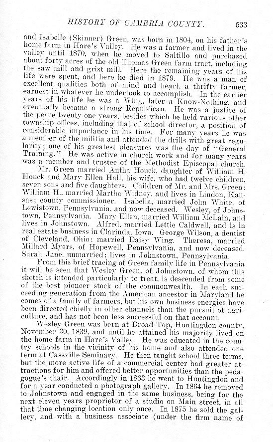 and Isabelle (Skinner) Green, was born in 1804, on his father's home farm in Hare's Valley. He was a farmer and lived in the valley until 1870, when he moved to Saltillo and purchased about forty acres of the old Thomas Green farm tract, including the saw mill and grist mill. Here the remaining years of his life were spent, and here he died in 1879. He was a man of excellent qualities both of mind and heart, a thrifty farmer, earnest in whatever he undertook to accomplish. In the earlier years of his life he was a Whig, later a Know-Nothing, and eventually became a strong Republican. He was a justice of the peace twenty-one years, besides which he held various other township offices, including that of school director, a position of considerable importance in his time. For many years he was a member of the militia and attended the drills with great regularity; one of his greatest pleasures was the day of “General Training.” He was active in church work and for many years was a member and trustee of the Methodist Episcopal church. Mr. Green married Antha Houck, daughter of William H. Houck and Mary Ellen Hall, his wife, who had twelve children, seven sons and five daughters. Children of Mr. and Mrs. Green: William H., married Martha Widney, and lives in Lindon, Kansas; county commissioner. Isabella, married John White, of Lewistown, Pennsylvania, and now deceased. Wesley, of Johnstown, Pennsylvania. Mary Ellen, married William McLain, and lives in Johnstown. Alfred, married Lettie Caldwell, and is in real estate business in Clarinda, Iowa. George Wilson, a dentist of Cleveland, Ohio; married Daisy Wing. Theresa, married Millard Myers, of Hopewell, Pennsylvania, and now deceased. Sarah Jane, unmarried: lives in Johnstown, Pennsylvania. From this brief tracing of Green family life in Pennsylvania it will be seen that Wesley Green, of Johnstown, of whom this sketch is intended particularly to treat, is descended from some of the best pioneer stock of the commonwealth. In each succeding generation from the American ancestor in Maryland he comes of a family of farmers, but his own business energies have been directed chiefly in other channels than the pursuit of agriculture, and has not been less successful on that account. Wesley Green was born at Broad Top, Huntingdon county, November 30, 1839, and until he attained his majority lived on the home farm in Hare's Valley. He was educated in the country schools in the vicinity of his home and also attended one term at Cassville Seminary. He then taught school three terms, but the more active life of a commercial center had greater attractions for him and offered better opportunities than the pedagogue's chair. Accordingly in 1863 he went to Huntingdon and for a year conducted a photograph gallery. In 1864 he removed to Johnstown and engaged in the same business, being for the next eleven years proprietor of a studio on Main street, in all that time changing location only once. In 1875 he sold the gallery, and with a business associate (under the firm name of |