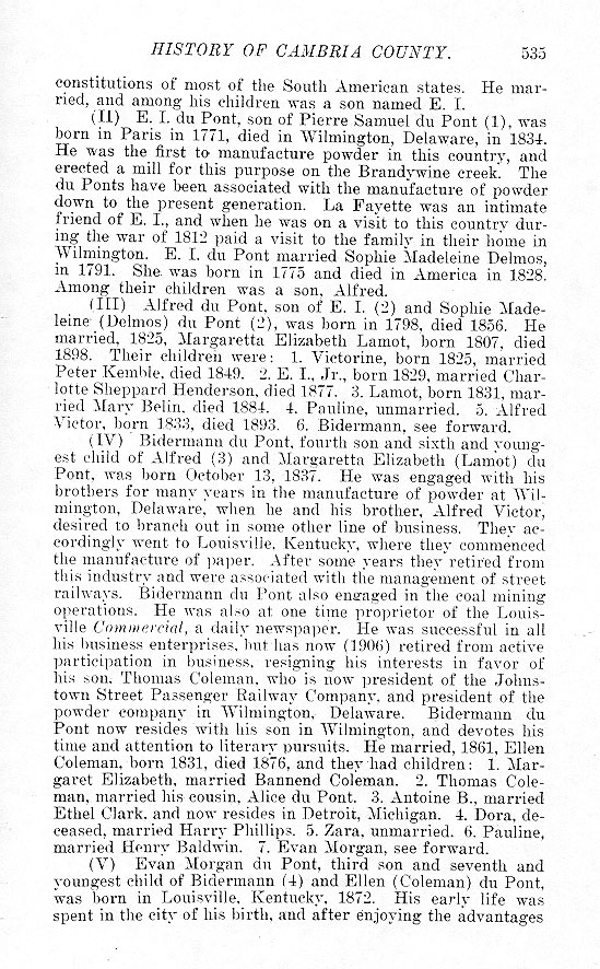 constitutions of most of the South American states. He married, and among his children was a son named E. I. (II) E. I. du Pont, son of Pierre Samuel du Pont (1), was born in Paris in 1771, died in Wilmington, Delaware, in 1834. He was the first to manufacture powder in this country, and erected a mill for this purpose on the Brandywine creek. The du Ponts have been associated with the manufacture of powder down to the present generation. La Fayette was an intimate friend of E. I., and when he was on a visit to this country during the war of 1812 paid a visit to the family in their home in Wilmington. E. I. du Pont married Sophie Madeleine Delmos, in 1791. She was born in 1775 and died in American in 1828. Among their children was a son, Alfred. (III) Alfred du Pont, son of E. I. (2) and Sophie Madeleine (Delmos) du Pont (2), was born in 1798, died 1856. He married, 1825, Margaretta Elisabeth Lamot, born 1807, died 1898. Their children were: 1. Victorine, born 1825, married Peter Kemble, died 1849. 2. E. I., Jr., born 1829, married Charlotte Sheppard Henderson, died 1877. 3. Lamot, born 1831, married Mary Belin, died 1884. 4. Pauline, unmarried, 5. Alfred Victor, born 1833, died 1893. 6. Bidermann, see forward. (IV) Bidermann du Pont, fourth son and sixth and youngest child of Alfred (3) and Margaretta Elizabeth (Lamot) du Pont, was born October 13, 1837. He was engaged with his brothers for many years in the manufacture of powder at Wilmington, Delaware, when he and his brother, Afred Victor, desired to branch out in some other line of business. They accordingly went to Louisville, Kentucky, where they commenced the manufacture of paper. After some years they retired from this industry and were associated with the management of street railways. Bidermann du Pont also engaged in the coal mining operations. He was also at one time proprietor of the Louisville Commerical, a daily newspaper. He was successful in all his business enterprises, but has now (1906) retired from active participation in business, resigning his interests in favor of his son, Thomas Coleman, who is now president of the Johnstown Street Passenger Railway Company, and president of the powder company in Wilmington, Delaware. Bidermann du Pont now resides with his son in Wilmington, and devotes his time and attention to literary pursuits. He married, 1861, Ellen Coleman, born 1831, died 1876, and they had children: 1. Margaret Elizabeth, married Bannend Coleman. 2. Thomas Coleman, married his cousin, Alice du Pont. 3. Antoine B., married Ethel Clark, and now resides in Detroit, Michigan. 4. Dora, deceased, married Harry Phillips. 5. Zara, unmarried. 6. Pauline, married Henry Baldwin. 7. Evan Morgan, see forward. (V) Evan Morgan du Pont, third son and seventh, and youngest child of Bidermann (4) and Ellen (Coleman) du Pont, was born in Louisville, Kentucky, 1872. His early life was spent in the city of his birth, and after enjoying the advantages |