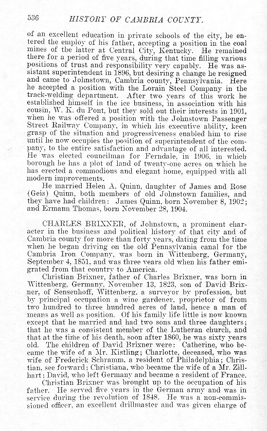 of an excellent education in private schools of the city, he entered the employ of his father, accepting a position in the coal mines of the latter at Central City, Kentucky. He remained there for a period of five years, during that time filling various positions of trust and responsibility very capably. He was assistant superintendent in 1896, but desiring a change he resigned and came to Johnstown, Cambria county, Pennsylvania. Here he accepted a position with the Lorain Steel Company in the track-welding department. After two years of his work he established himself in the ice business, in association with his cousin, W. K. du Pont, but they sold out their interests in 1901, when he was offered a position with the Johnstown Passenger Street Railway Company, in which his executive ability, keen grasp of the situation and progressiveness enabled him to rise until he now occupies the position of superintendent of the company, to the entire satisfaction and advantage of all interested. He was elected councilman for Ferndale, in 1906, in which borough he has a plot of land of twenty-one acres on which he has erected a commodious and elegant home, equipped with all modern improvements. He married Helen A. Quinn, daughter of James and Rose (Geis) Quinn, both members of old Johnstown families, and they have had children: James Quinn, born November 8, 1902; and Ermann Thomas, born November 28, 1904. CHARLES BRIXNER, of Johnstown, a prominent character in the business and political history of that city and of Cambria county for more than forty years, dating from the time when he began driving on the old Pennsylvania canal for the Cambria Iron Company, was born in Wittenberg, Germany, September 4, 1851, and was three years old when his father emigrated from that country to American. Christian Brixner, father of Charles Brixner, was born in Wittenberg, Germany, November 13, 1823, son of David Brixner, of Sensenhoff, Wittenberg, a surveyor by profession, but by principal occupation a wine gardener, proprietor of from two hundred to three hundred acres of land, hence a man of means as well as position. Of his family life little is now known except that he married and had two sons and three daughters; that he was a consistent member of the Lutheran church, and that at the time of his death, soon after 1860, he was sixty years old. The children of David Brixner were: Catherine, who became the wife of a Mr. Kistling; Charlotte, deceased, who was wife of Frederick Schramm, a resident of Philadelphia; Christian, see forward; Christiana, who became the wife of a Mr. Zillhart; David, who left Germany and became a resident of France. Christian Brixner was brought up to the occupation of his father. He served five years in the German army and was in service during the revolution in 1848. He was a non-commisioned officer, an excellent drillmaster and was given charge of |