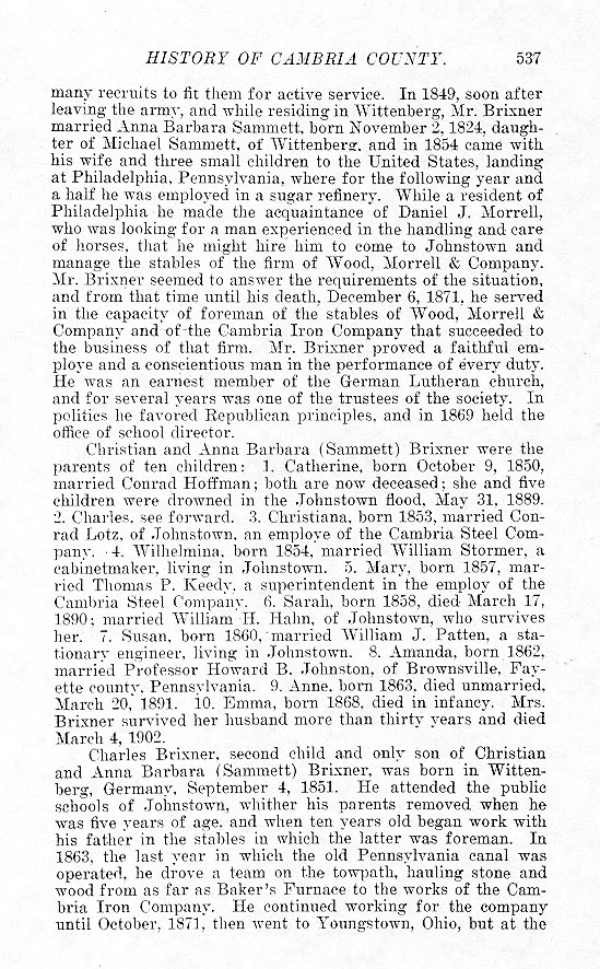 many recruits to fit them for active service. In 1849, soon after leaving the army, and while residing in Wittenberg, Mr. Brixner married Anna Barbara Sammett, born November 2, 1824, daughter of Michael Sammett, of Wittenberg, and in 1854 came with his wife and three small children to the United States, landing at Philadelphia, Pennsylvania, where for the following year and a half he was employed in a sugar refinery. While a resident of Philadelphia he made the acquaintance of Daniel J. Morrell, who was looking for a man experienced in the handling and care of horses, that he might hire him to come to Johnstown and manage the stables of the firm of Wood, Morrell & Company. Mr. Brixner seemed to answer the requirements of the situation, and from that time until his death, December 6, 1871, he served in the capacity of foreman of the stables of Wood, Morrell & Company and of the Cambria Iron Company that succeeded to the business of that firm. Mr. Brixner proved a faithful employe and a conscientious man in the performance of every duty. He was an earnest member of the German Lutheran church, and for several years was one of the trustees of the society. In politics he favored Republican principles, and in 1869 held the office of school director. Christian and Anna Barbara (Sammett) Brixner were the parents of ten children: 1. Catherine, born October 9, 1850, married Conrad Hoffman; both are now deceased; she and five children were drowned in the Johnstown flood, May 31, 1889. 2. Charles, see forward. 3. Christiana, born 1853, married Conrad Lotz, of Johnstown, an employe of the Cambria Steel Company. 4. Wilhelmina, born 1854, married William Stormer, a cabinetmaker, living in Johnstown. 5. Mary, born 1857, married Thomas P. Keedy, a superintendent in the employ of the Cambria Steel Company. 6. Sarah, born 1858, died March 17, 1890; married William H. Hahn, of Johnstown, who survives her. 7. Susan, born 1860, married William J. Patten, a stationary engineer, living in Johnstown. 8. Amanda, born 1862, married Professor Howard B. Johnston, of Brownsville, Fayette county, Pennsylvania. 9. Anne, born 1863, died unmarried, March 20, 1891. 10. Emma, born 1868, died in infancy. Mrs. Brixner survived her husband more than thirty years and died March 4, 1902. Charles Brixner, second child and only son of Christian and Anna Barbara (Sammett) Brixner, was born in Wittenberg, Germany, September 4, 1851. He attended the public schools of Johnstown, whither his parents removed when he was five years of age, and when ten years old began work with his father in the stables in which the latter was foreman. In 1863, the last year in which the old Pennsylvania canal was operated, he drove a team on the towpath, hauling stone and wood from as far as Baker's furnace to the works of the Cambria Iron Company. He continued working for the company until October, 1871, then went to Youngstown, Ohio, but at the |