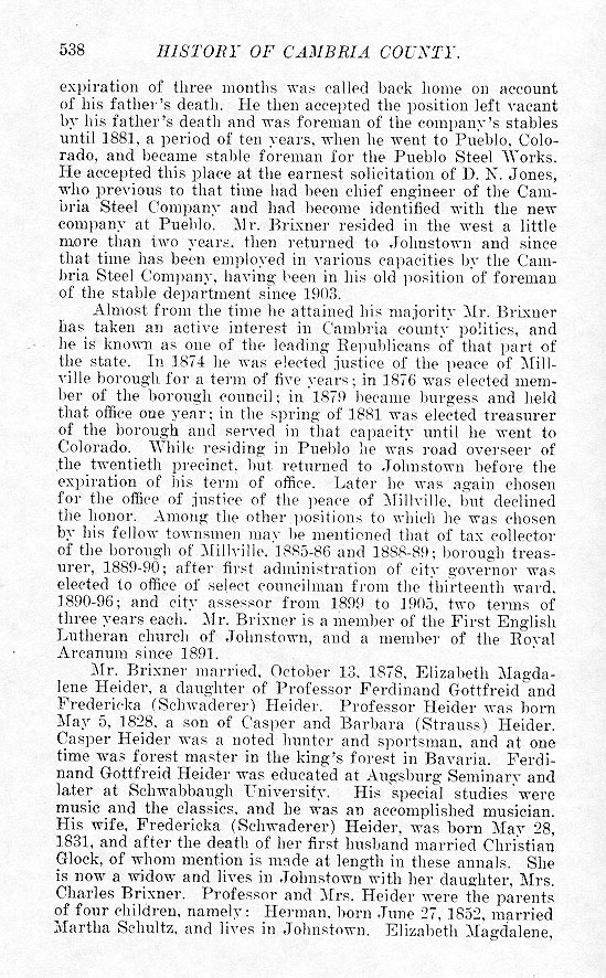expiration of three months was called back home on account of his father's death. He then accepted the position left vacant by his father's death and was foreman of the company's stables until 1881, a period of ten years, when he went to Pueblo, Colorado, and became stable foreman for the Pueblo Steel Works. He accepted this place at the earnest solicitation of D. N. Jones, who previous to that time had been chief engineer of the Cambria Steel Company and had become identified with the new company at Pueblo. Mr. Brixner resided in the west a little more than two years, then returned to Johnstown and since that time has been employed in various capacities by the Cambria Steel Company, having been in his old position of foreman of the stable department since 1903. Almost from the time he attained his majority Mr. Brixner has taken an active interest in Cambria county politics, and he is known as one of the leading Republicans of that part of the state. In 1874 he was elected justice of the peace of Millville borough for a term of five years; in 1876 was elected member of the borough council; in 1879 became burgess and held that office one year; in the spring of 1881 was elected treasurer of the borough and served in that capacity until he went to Colorado. When residing in Pueblo he was road overseer of the twentieth precinct, but returned to Johnstown before the expiration of his term of office. Later he was again chosen for the office of justice of the peace of Millville, but declined the honor. Among the other positions to which he was chosen by his fellow townsmen may be mentioned that of tax collector of the borough of Millville, 1885-86 and 1888-89; borough treasurer, 1889-90; after first administration of the city governor was elected to office of select councilman from the thirteenth ward, 1890-96; and city assessor from 1899-1905, two terms of three years each. Mr. Brixner is a member of the First English Lutheran church of Johnstown, and a member of the Royal Arcanum since 1891. Mr. Brixner married, October 13, 1878, Elizabeth Magdalene Heider, a daughter of Professor Ferdinand Gottfreid and Fredericka (Schwaderer) Heider. Professor Heider was born May 5, 1828, a son of Casper and Barbara (Strauss) Heider. Casper Heider was a noted hunter and sportsman, and at one time was forest master in the king's forest in Bavaria. Ferdinand Gottfreid Heider was educated at Augsburg Seminary and later at Schwabbaugh University. His special studies were music and the classics, and he was an accomplished musician. His wife Fredericka (Schwaderer) Heider, was born May 28, 1831, and after the death of her first husband married Christian Glock, of whom mention is made at length in these annals. She is now a widow and lives in Johnstown with her daughter, Mrs. Charles Brixner. Professor and Mrs. Heider were the parents of four children, namely: Herman, born June 27, 1852, married Martha Schultz, and lives in Johnstown. Elizabeth Magdalene, |