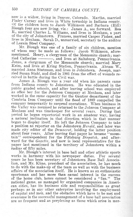 now is a widow, living in Denver, Colorado. Martha, married Finley Carney and lives in White township in Indiana county. Of the children born to Jacob Wilkinson and Barbara (Hill) Blough four are now living, viz.: James A., see forward. Rea R., married Charles L Williams, and lives in Moxham, a part of the city of Johnstown. Frances, married Casper Fisher, and lives in Moxham. Sarah D., unmarried, secretary to the auditor of Lorain Steel Company. Mr. Blough was one of a family of six children, mention of whom may be made as follows: Jacob Wilkinson, aforementioned. Henry, a clergyman of the Mennonite church; married Catherine_____, and lives at Saltsburg, Pennsylvania. Jonas, a clergyman of the Mennonite church; married Mary Keim, and lives at Kring Station, Pennsylvania. Abram W., married Anna Stutzman, and lives in Johnstown. Joseph, married Susan Stahl, and died in 1901 from the effect of wounds received in battle during the Civil war. James A. Blough was a year old when his parents came from Indiana county to Johnstown. He was educated in the public graded schools, and after leaving school was employed as office boy for the Johnson Company at Moxham, and later worked in the same capacity for the Gautier department of the Cambria Iron Company until the flood of 1889 compelled the company temporarily to suspend operations. When business in the Valley was resumed he returned to the Johnson Company at Moxham and was timekeeper for several years. During that period he began reportorial work in an amateur way, having a natural inclination in that direction which in that manner began to display itself. He left the Johnson Company to take a position as reporter on the Johnstown Herald, and later was made city editor of the Democrat, holding the latter position about four years. After leaving that paper he became “mountain” correspondent for the Pittsburg Dispatch, and afterward for the Gazette, and now is local representative for the paper last mentioned in the territory of Johnstown within a radius of fifty miles. Mr. Blough's interest in base ball and other athletic sports works in harmony with his newspaper duties. For several years he has been secretary of Johnstown Base Ball Association, and Mr. Kline, president of the association, he has much to do with the make-up of the team as well as with the business affairs of the association itself. He is known as an enthusiastic sportsman and has more than casual interest in the success of the home club, hence cannot be considered a “fan.” The national game, as managed by organized companies in American cities, has its business side and responsibilities as great perhaps as in any other enterprise involving the employment of capital and men, and the obstacles which have to be met and overcome in the successful management of a base ball association are as frequent and as perplexing as those which arise in mer- |