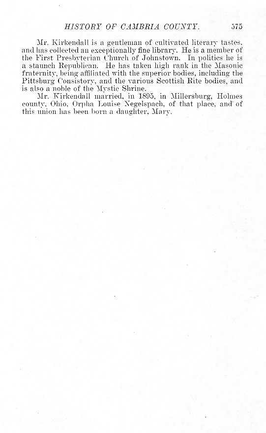 Mr. Kirkendall is a gentleman of cultivated literary tastes, and has collected an exceptionally fine library. He is a member of the First Presbyterian Church of Johnstown. In politics he is a staunch Republican. He has taken high rank in the Masonic fraternity, being affiliated with the superior bodies, including the Pittsburg Consistory, and the various Scottish Rite bodies, and Is also a noble of the Mystic Shrine.