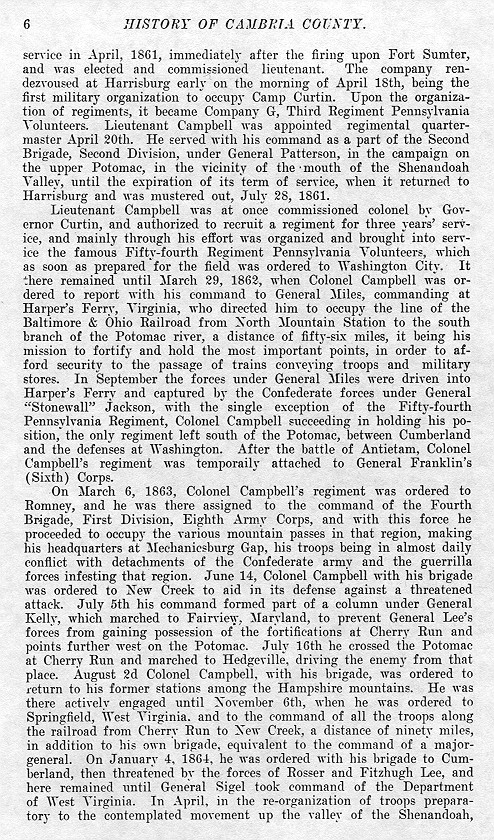 service in April, 1861, immediately after the firing upon Fort Sumter, and was elected and commissioned lieutenant. The company rendezvoused at Harrisburg early on the morning of April 18th, being the first military organization to occupy Camp Curtin. Upon the organization of regiments, it became Company G, Third Regiment Pennsylvania Volunteers. Lieutenant Campbell was appointed regimental quartermaster April 20th. He served with his command as a part of the Second Brigade, Second Division, under General Patterson, in the campaign on the upper Potomac, in the vicinity of the mouth of the Shenandoah Valley, until the expiration of its term of service, when it returned to Harrisburg and was mustered out, July 28, 1861. Lieutenant Campbell was at once commissioned colonel by Governor Curtin, and authorized to recruit a regiment for three years' service, and mainly through his effort was organized and brought into service the famous Fifty-fourth Regiment Pennsylvania Volunteers, which as soon as prepared for the field was ordered to Washington City. It there remained until March 29, 1862, when Colonel Campbell was ordered to report with his command to General Miles, commanding at Harper's Ferry, Virginia, who directed him to occupy the line of the Baltimore & Ohio Railroad from North Mountain Station to the south branch of the Potomac river, a distance of fifty-six miles, it being his mission to fortify and hold the most important points, in order to afford security to the passage of trains conveying troops and military stores. In September the forces under General Miles were driven into Harper's Ferry and captured by the Confederate forces under General "Stonewall" Jackson, with the single exception of the Fifty-fourth Pennsylvania Regiment, Colonel Campbell succeeding in holding his position, the only regiment left south of the Potomac, between Cumberland and the defenses at Washington. After the battle of Antietam, Colonel Campbell's regiment was temporaily attached to General Franklin's (Sixth) Corps. On March 6, 1863, Colonel Campbell's regiment was ordered to Romney, and he was there assigned to the command of the Fourth Brigade, First Division, Eighth Army Corps, and with this force he proceeded to occupy the various mountain passes in that region, making his headquarters at Mechanicsburg Gap, his troops being in almost daily conflict with detachments of the Confederate army and the guerrilla forces infesting that region. June 14, Colonel Campbell, with his brigade was ordered to New Creek to aid in its defense against a threatened attack. July 5th his command formed part of a column under General Kelly, which marched to Fairview, Maryland, to prevent General Lee's forces from gaining possession of the fortifications at Cherry Run and points further west on the Potomac. July 16th he crossed the Potomac at Cherry Run and marched to Hedgeville, driving the enemy from that place. August 2d Colonel Campbell, with his brigade, was ordered to return to his former stations among the Hampshire mountains. He was there actively engaged until November 6th, when he was ordered to Springfield, West Virginia, and to the command of all the troops along the railroad from Cherry Run to New Creek, a distance of ninety miles, in addition to his own brigade, equivalent to the command of a major-general. On January 4th, 1864, he was ordered with his brigade to Cumberland, then threatened by the forces of Rosser and Fitzhugh Lee, and here remained until General Sigel took command of the Department of West Virginia. In April, in the re-organization of troops preparatory to the contemplated movement up the valley of the Shenandoah, |