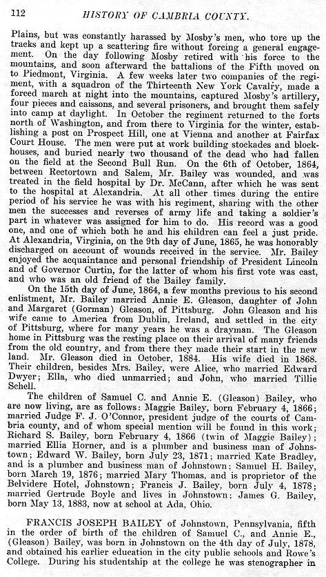 Plains, but was constantly harassed by Mosby's men, who tore up the tracks and kept up a scattering fire without forcing a general engagement. On the day following Mosby retired with his force to the mountains, and soon afterward the battalions of the Fifth moved on to Piedmont, Virginia. A few weeks later two companies of the regiment, with a squadron of the Thirteenth New York Cavalry, made a forced march at night into the mountains, captured Mosby's artillery, four pieces and caissons, and several prisoners, and brought them safely into camp at daylight. In October the regiment returned to the forts north of Washington, and from there to Virginia for the winter, establishing a post on Prospect Hill, one at Vienna and another at Fairfax Court House. The men were put at work building stockades and blockhouses, and buried nearly two thousand of the dead who had fallen on the field at the Second Bull Run. On the 6th of October, 1864, between Rectortown and Salem, Mr. Bailey was wounded, and was treated in the field hospital by Dr. McCann, after which he was sent to the hospital at Alexandria. At all other times during the entire period of his service he was with his regiment, sharing with the other men the successes and reverses of army life and taking a soldier's part in whatever was assigned for him to do. His record was a good one, and one of which both he and his children can feel a just pride. At Alexandria, Virginia, on the 9th day of June, 1865, he was honorably discharged on account of wounds received in the service. Mr. Bailey enjoyed the acquaintance and personal friendship of President Lincoln and of Governor Curtin, for the latter of whom his first vote was cast, and who was an old friend of the Bailey family. On the 15th day of June, 1864, a few months previous to his second enlistment, Mr. Bailey married Annie E. Gleason, daughter of John and Margaret (Gorman) Gleason, of Pittsburg. John Gleason and his wife came to America from Dublin, Ireland, and settled in the city of Pittsburg, where for many years he was a drayman. The Gleason home in Pittsburg was the resting place on their arrival of many friends from the old country, and from there they made their start in the new land. Mr. Gleason died in October, 1884. His wife died in 1868. Their children, besides Mrs. Bailey, were Alice, who married Edward Dwyer; Ella, who died unmarried; and John, who married Tillie Schell. The children of Samuel C. and Annie E. (Gleason) Bailey, who are now living, are as follows: Maggie Bailey, born February 4, 1866; married Judge F. J. O'Connor, president judge of the courts of Cambria county, and of whom special mention will be found in this work; Richard S. Bailey, born February 4, 1866 (twin of Maggie Bailey); married Ellia Horner, and is a plumber and business man of Johnstown; Edward W. Bailey, born July 23, 1871; married Kate Bradley, and is a plumber and business man of Johnstown; Samuel H. Bailey, born March 19, 1876; married Mary Thomas, and is proprietor of the Belvidere Hotel, Johnstown; Francis J. Bailey, born July 4, 1878; married Gertrude Boyle and lives in Johnstown; James G. Bailey, born May 13, 1883, now at school at Ada, Ohio. FRANCIS JOSEPH BAILEY of Johnstown, Pennsylvania, fifth in the order of birth of the children of Samuel C., and Annie E., (Gleason) Bailey, was born in Johnstown on the 4th day of July, 1878, and obtained his earlier education in the city public schools and Rowe's College. During his studentship at the college he was stenographer in |