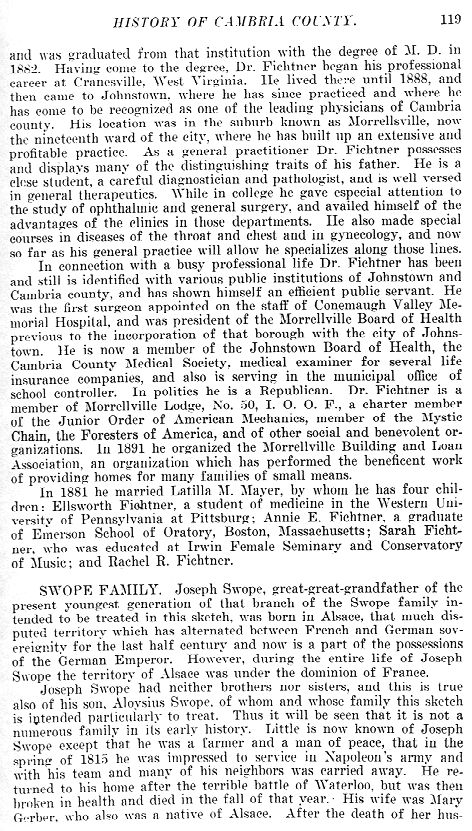 and was Graduated from that institution with the degree of M. D. in 1882. Having come to the degree, Dr. Fichtner began his professional career at Cranesville, West Virginia. He lived there until 1888, and then came to Johnstown, where he has since practiced and where he has come to be recognized as one of the leading physicians of Cambria county. His location was in the suburb known as Morrellsville, now the nineteenth ward of the city, where he has built up an extensive and profitable practice. As a general practitioner Dr. Fichtner possesses and displays many of the distinguishing traits of his father. He is a close student, a careful diagnostician and pathologist, and is well versed in general therapeutics. While in college he gave especial attention to the study of ophthalmic and general surgery, and availed himself of the advantages of the clinics in those departments. He also made special courses in diseases of the throat and chest and in gynecology, and now so far as his general practice will allow he specializes along those lines. In connection with a busy professional life Dr. Fichtner has been and still is identified with various public institutions of Johnstown and Cambria county, and has shown himself an efficient public servant. He was the first surgeon appointed on the staff of Conemaugh Valley Memorial Hospital, and was president of the Morrellville Board of Health previous to the incorporation of that borough with the city of Johnstown. He is now a member of the Johnstown Board of Health, the Cambria County Medical Society, medical examiner for several life insurance companies, and also is serving in the municipal office of school controller. In politics he is a Republican. Dr. Fichtner is a member of Morrellville Lodge, No. 50, I. 0. 0. F., a charter member of the Junior Order of American Mechanics, member of the Mystic Chain, the Foresters of America, and of other social and benevolent organizations. In 1891 he organized the Morrellville Building and Loan Association, an organization which has performed the beneficent work of providing homes for many families of small means. In 1881 he married Latilla M. Mayer, by whom he has four children: Ellsworth Fichtner, a student of medicine in the Western University of Pennsylvania at Pittsburg; Annie E. Fichtner, a graduate of Emerson School of Oratory, Boston, Massachusetts; Sarah Fiehtner, who was educated at Irwin Female Seminary and Conservatory of Music; and Rachel R. Fiehtner. SWOPE FAMILY. Joseph Swope, Great-great-grandfather of the present youngest generation of that branch of the Swope family intended to be treated in this sketch, was born in Alsace, that much disputed territory which has alternated between French and German sovereignity for the last half century and now is a part of the possessions of the German Emperor. However, during the entire life of Joseph Swope the territory of Alsace was under the dominion of France. Joseph Swope had neither brothers nor sisters, and this is true also of his son, Aloysius Swope, of whom and whose family this sketch is intended particularly to treat. Thus it will be seen that it is not a numerous family in its early history. Little is now known of Joseph Swope except that he was a farmer and a man of peace, that in the spring of 1815 he was impressed to service in Napoleon's army and with his team and many of his neighbors was carried away. He returned to his home after the terrible battle of Waterloo, but was then broken in health and died in the fall of that year. His wife was Mary Gerber, who also was a native of Alsace. After the death of her hus- |