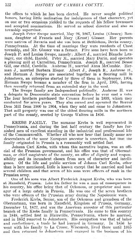the offices to which he has been elected. He never sought political honors, having little inclination for indulgences of that character, yet on one or two occasions yielded to the requests of his fellow townsmen and accepted nominations. He served as school director and also as township supervisor. Joseph Peter Swope married, May 26, 1861, Louisa (Glasser) Bauman, daughter of Francis and Mary (Ernst) Glasser. Her parents were natives of Bavaria and she was born at Bethlehem, Berks county, Pennsylvania. At the time of marriage they were residents of Chest township, and Mr. Glasser was a farmer. Five sons have been born to Joseph P. and Louisa Swope, namely: Albert J., married Blanche Litzinger, one child, Harold. Peter M., married Mary Durin, and operates a planing mill at Carrollton, Pennsylvania. Joseph R., married Bessie Gill, one child, Cordelia. Ambrose H., married Anna MeCombie. Herman J., married Barbara Rigger. Albert J., Joseph R., Ambrose H., and Herman J. Swope are associated together in a flouring mill in Johnstown, an enterprise started by three of them in September, 1904. Herman Swope became a member of the firm in April, 1905, having then recently returned from an extended stay in the west. The Swope family are Independent politically. Ambrose H. was a delegate to Democratic state convention before he ever cast a vote. The four brothers purchased the Cresson Record in 1899, which they conducted for seven years. They also owned and operated the Beaver Dam Mill from 1900 to 1904, when they sold and came to Johnstown. That mill property was one of the oldest flouring mills in the northern part of the county, erected by George Walters in 1856. KREBS FAMILY. The surname Krebs is well represented in Pennsylvania, and during the last half century the family has furnished men of excellent standing in the industrial and professional life of the Commonwealth. Whether all who now bear that family name are descendants of the same European ancestor is uncertain, but that the family originated in Prussia, is a reasonably well settled fact. Johann Carl Krebs, with whom this narrative begins, was an official of the Prussian government, and his office was that of Oberamtman, or chief magistrate of the county, an office of dignity and responsibility and its incumbent chosen from men of character and intelligence. Of the life and public services of Johann Carl Krebs, other than is here mentioned, little is known except that he married and had several children and that seven of his sons were officers of rank in the Prussian army. One of his sons was Albert Frederick August Krebs, who was born at Mansfield, Prussia. Like his father he was a man of consequence in his country, his office being that of Oekonom, or proprietor and manager of a large estate in Prussia. He was one of the seven brothers who were officers of the Prussian army during the Napoleonic wars. Frederick Krebs, Senior, son of the Oekonom and grandson of the Oberamtman, was born in Mansfield, Kingdom of Prussia, Germany, December 13, 1822, and was the American ancestor of this particular branch of the Krebs family in Pennsylvania. He came to this country in 1818, settled first in Blairsville, Pennsylvania, where he married, and in 1852 removed to Johnstown. His occupation was that of baker and confectioner, a trade he had learned in Germany. In 1856 he went with his family to La Crosse, Wisconsin, lived there until 1865 and then returned to Johnstown and engaged in the business of his |