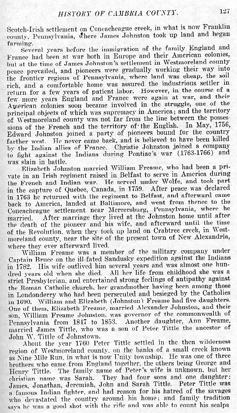 Scotch-Irish settlement on Coneacheague creek, in what is now Franklin county, Pennsylvania, where James Johnston took up land and began farming. Several years before the immigration of the family England and France had been at war both in Europe and their American colonies, but, at the time of James Johnston's settlement in Westmoreland county peace prevailed, and pioneers were gradually working their way into the frontier regions of Pennsylvania, where land was cheap, the soil rich, and a comfortable home was assured the industrious settler in return for a few years of patient labor. However, in the course of a few more years England and France were again at war, and their American colonies soon became involved in the struggle, one of the principal objects of which was supremacy in America; and the territory of Westmoreland county was not far from the line between the possessions of the French and the territory of the English. In May, 1756, Edward Johnston joined a party of pioneers bound for the country farther west. He never came back, and is believed to have been killed by the Indian allies of France. Christie Johnston joined a company to fight against the Indians during Pontiac's war (1763-1766) and was slain in battle. Elizabeth Johnston married William Freame, who had been a private in an Irish regiment raised in Belfast to serve in America during the French and Indian war. He served under Wolfe, and took part in the capture of Quebec, Canada, in 1759. After peace was declared in 1763 he returned with the regiment to Belfast, and afterward came back to America, landed at Baltimore, and went from thence to the Coneacheague settlement near Mercersburg, Pennsylvania, where he married. After marriage they lived at the Johnston home until after the death of the pioneer and his wife, and afterward until the time of the Revolution, when they took up land on Crabtree creek, in Westmoreland county, near the site of the present town of New Alexandria, where they ever afterward lived. William Freame was a member of the military company under Captain Bruce on the ill-fated Sandusky expedition against the Indians in 1782. His wife outlived him several years and was almost one hundred years old when she died. All her life from childhood she was a strict Presbyterian, and entertained strong feelings of antipathy against the Roman Catholic church,. her grandmother having been among those in Londonderry who had been persecuted and besieged by the Catholics in 1690. William and Elizabeth (Johnston) Freame had five daughters. One of them, Elizabeth Freame, married Alexander Johnston, and their son, William Freame Johnston, was governor of the commonwealth of Pennsylvania from 1847 to 1853. Another daughter, Ann Freame, married James Tittle, who was a son of Peter Tittle the ancestor of John W. Tittle of Johnstown. About the year 1760 Peter Tittle settled in the then wilderness region of Westmoreland county, on the banks of a small creek known as Nine Mile Run, in what is now Unity township. He was one of three brothers who came from England together, the others being George and Henry Tittle. The family name of Peter's wife is unknown, but her christian name was Sarah. They had four sons and one daughter: James, Jonathan, Jeremiah, John and Sarah Tittle. Peter Tittle was a famous Indian fighter, and had reason for his hatred of the savages who devastated the country around his home; and family tradition says he was a good shot with the rifle and was able to count his scalps |