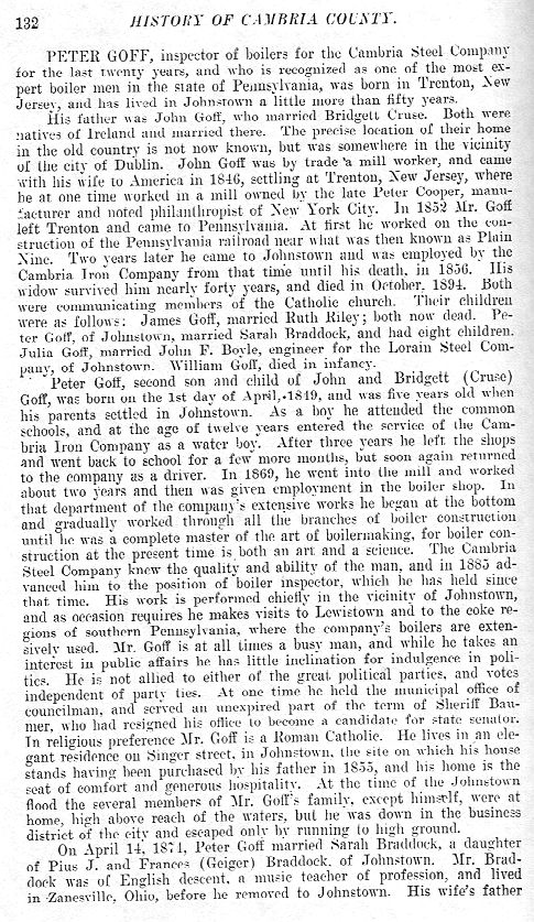 PETER GOFF, inspector of boilers for the Cambria Steel Company for the last twenty years, and who is recognized as one of the most expert boiler men in the state of Pennsylvania, was born in Trenton, New Jersey, and has lived in Johnstown a little more than fifty years. His father was John Goff, who married Bridgett Cruse. Both were natives of Ireland and married there. The precise location of their home in the old country is not now known, but was somewhere in the vicinity of the city of Dublin. John Goff was by trade a mill worker, and came with his wife to America in 1846, settling at Trenton, New Jersey, where he at one time worked in a mill owned by the late Peter Cooper, manufacturer and noted philanthropist of New York City. In 1852 Mr. Goff left Trenton and came to Pennsylvania. At first he worked on the construction of the Pennsylvania railroad near what was then known as Plain Nine. Two years later he came to Johnstown and was employed by the Cambria Iron Company from that time until his death, in 1866. His widow survived him nearly forty years, and died in October, 1894. Both were communicating members of the Catholic church. Their children were as follows: James Goff, married Ruth Riley; both now dead. Peter Goff, of Johnstown, married Sarah Braddock, and had eight children. Julia Goff, married John F. Boyle, engineer for the Lorain Steel Company, of Johnstown. William Goff, died in infancy. Peter Goff, second son and child of John and Bridgett (Cruse) Goff, was born on the 1st day of April, 1849, and was five years old when his parents settled in Johnstown. As a baby he attended the common schools, and at the age of twelve years entered the service of the Cambria Iron Company as a water boy. After three years he left the shops and went back to school for a few more months, but soon again returned to the company as a driver. In 1869, he went into the mill and worked about two years and then was given employment in the boiler shop. In that department of the company's extensive works he began at the bottom and gradually worked through all the branches of boiler construction until he was a complete master of the art of boilermaking, for boiler construction at the present time is both an art and a science. The Cambria Steel Company knew the quality and ability of the man, and in 1885 advanced him to the position of boiler inspector, which he has held since that time. His work is performed chiefly in the vicinity of Johnstown, and as occasion requires he makes visits to Lewistown and to the coke regions of southern Pennsylvania, where the company boilers are extensively used. Mr. Goff is at all times a busy man, and while he takes an interest in public affairs he has little inclination for indulgence in polities. He is not allied to either of the great political parties, and votes independent of party ties. At one time he held the municipal office of councilman, and served an unexpired part of the term of Sheriff Baumer, who had resigned his office to become a candidate for state senator. In religious preference Mr. Goff is a Roman Catholic. He lives in an elegant residence on Singer street, in Johnstown, the site on which his house stands having been purchased by his father in 1855, and his home is the seat of comfort and generous hospitality. At the time of the Johnstown flood the several members of Mr. Goff's family, except himself, were at home, high above reach of the waters, but be was down in the business district of the city and escaped only by running to high ground. On April 14, 1874, Peter Goff married Sarah Braddock, a daughter of Pius J. and Frances (Geiger) Braddock, of Johnstown. Mr. Braddock was of English descent, a music teacher of profession, and lived in Zanesville, Ohio, before he removed to Johnstown. His wife's father |