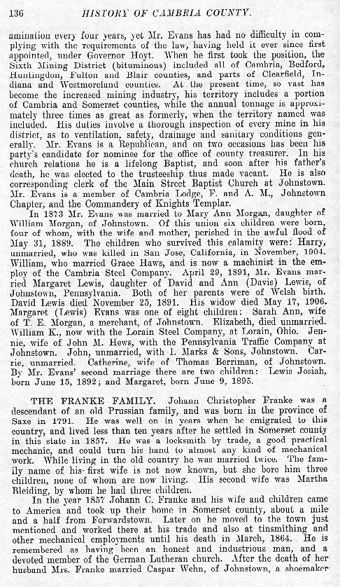 amination every four years, yet Mr. Evans has had no difficulty in complying with the requirements of the law, having held it ever since first appointed, under Governor Hoyt. When he first took the position, the Sixth Mining District (bituminous) included all of Cambria, Bedford, Huntingdon, Fulton and Blair counties, and parts of Clearfield, Indiana and Westmoreland counties. At the present time, so vast has become the increased mining industry, his territory includes a portion of Cambria and Somerset counties, while the annual tonnage is approximately three times as great as formerly, when the territory named was included. His duties involve a thorough inspection of every mine in his district, as to ventilation, safety, drainage and sanitary conditions generally. Mr. Evans is a Republican, and on two occasions has been his party's candidate for nominee for the office of county treasurer. In his church relations he is a lifelong Baptist, and soon after his father's death, he was elected to the trusteeship thus made vacant. He is also corresponding clerk of the Main Street Baptist Church at Johnstown. Mr. Evans is a member of Cambria Lodge, F. and A. M., Johnstown Chapter, and the Commandery of Knights Templar. In 1873 Mr. Evans was married to Mary Ann Morgan, daughter of William Morgan, of Johnstown. Of this union six children were born, four of whom, with the wife and mother, perished in the awful flood of May 31, 1889. The children who survived this calamity were: Harry, unmarried, who was killed in San Jose, California, in November, 1901. William, who married Grace Haws, and is now a machinist in the employ of the Cambria Steel Company. April 29, 1891, Mr. Evans married Margaret Lewis, daughter of David and Ann (Davis) Lewis, of Johnstown, Pennsylvania. Both of her parents were of Welsh birth. David Lewis died November 25, 1891. His widow died May 17, 1906. Margaret (Lewis) Evans was one of eight children: Sarah Ann, wife of T. E. Morgan, a merchant, of Johnstown. Elizabeth, died unmarried. William K., now with the Lorain Steel Company, at Lorain, Ohio. Jennie, wife of John M. Hews, with the Pennsylvania Traffic Company at Johnstown. John, unmarried, with I. Marks & Sons, Johnstown. Carrie, unmarried. Catherine, wife of Thomas Berriman, of Johnstown. By Mr. Evans' second marriage there are two children: Lewis Josiah, born June 15, 1892; and Margaret, born June 9, 1895. THE FRANKE FAMILY. Johann Christopher Franke was a descendant of an old Prussian family, and was born in the province of Saxe in 1791. He was well on in years when he emigrated to this country, and lived less than ten years after he settled in Somerset county in this state in 1857. He was a locksmith by trade, a good practical mechanic, and could turn his hand to almost any kind of mechanical work. While living in the old country he was married twice. The family name of his first wife is not now known, but she bore him three children, none of whom are now living. His second wife was Martha Bleiding, by whom he had three children. In the year 1857 Johann C. Franke and his wife and children came to America and took up their home in Somerset county, about a mile and a half from Forwardstown. Later on he moved to the town just mentioned and worked there at his trade and also at tinsmithing and other mechanical employments until his death in March, 1864. He is remembered as having been an honest and industrious man, and a devoted member of the German Lutheran church. After the death of her husband Mrs. Franke married Caspar Wehn, of Johnstown, a shoemaker |