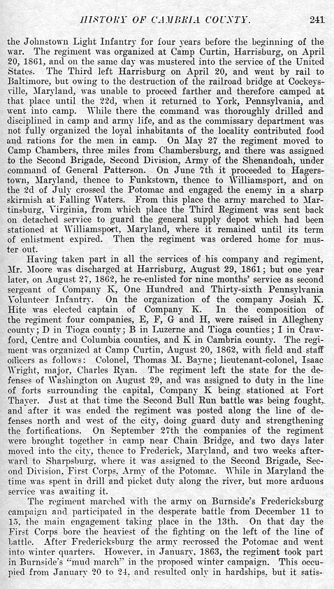 the Johnstown Light Infantry for four years before the beginning of the war. The regiment was organized at Camp Curtin, Harrisburg, on April 20, 1861, and on the same day was mustered into the service of the United States. The Third left Harrisburg on April 20, and went by rail to Baltimore, but owing to the destruction of the railroad bridge at Cockeysville, Maryland, was unable to proceed farther and therefore camped at that place until the 22d, when it returned to York, Pennsylvania, and went into camp. While there the command was thoroughly drilled and disciplined in camp and army life, and as the commissary department was not fully organized the loyal inhabitants of the locality contributed food and rations for the men in camp. On May 27 the regiment moved to Camp Chambers, three miles from Chambersburg, and there was assigned to the Second Brigade, Second Division, Army of the Shenandoah, under command of General Patterson. On June 7th it proceeded to Hagerstown, Maryland, thence to Funkstown, thence to Williamsport, and on the 2d of July crossed the Potomac and engaged, the enemy in a sharp skirmish at Falling Waters. From this place the army marched to Martinsburg, Virginia, from which place the Third Regiment was sent back on detached service to guard the general supply depot which had been stationed at Williamsport, Maryland, where it remained until its term of enlistment expired. Then the regiment was ordered home for muster out. Having taken part in all the services of his company and regiment, Mr. Moore was discharged at Harrisburg, August 29, 1861; but one year later, on August 27, 1862, he reenlisted for nine months' service as second sergeant of Company K, One Hundred and Thirty-sixth Pennsylvania volunteer Infantry. On the organization of the company Josiah K. Hite was elected captain of Company K. In the composition of the regiment four companies, E, F, G and H, were raised in Allegheny county; D in Tioga county; B in Luzerne and Tioga counties; I in Crawford, Centre and Columbia counties, and K in Cambria county. The regiment was organized at Camp Curtin, August 20, 1862, with field and staff officers as follows: Colonel, Thomas M. Bayne; lieutenant-colonel, Isaac Wright, major, Charles Ryan. The regiment left the state for the defenses of Washington on August 29, and was assigned to duty in the line of forts surrounding the capital, Company K being stationed at Fort Thayer. Just at that time the Second Bull Run battle was being fought, and after it was ended the regiment was posted along the line of defenses north and west of the city, doing guard duty and strengthening the fortifications. On September 27th the companies of the regiment were brought together in camp near Chain Bridge, and two days later moved into the city, thence to Frederick, Maryland, and two weeks afterward to Sharpsburg, where it was assigned to the Second Brigade, Second Division, First Corps, Army of the Potomac. While in Maryland the time was spent in drill and picket duty along the river, but more arduous service was awaiting it. The regiment marched with the army on Burnside's Fredericksburg campaign and participated in the desperate battle from December 11 to l5, the main engagement taking place in the 13th. On that day the First Corps bore the heaviest of the fighting on the left of the line of battle. After Fredericksburg the army recrossed the Potomac and went into winter quarter. However, in January, 1863, the regiment took part in Burnside's "mud march" in the proposed winter campaign. This occupied from January 20 to 24, and resulted only in hardships, but it satis- |