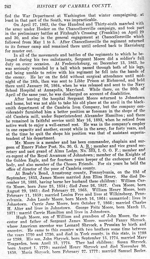 fied the War Department at Washington that winter campaigning, at least in that part of the South, was impracticable. On April 27, 1863, the One Hundred and Thirty-sixth marched with the army under Hooker on the Chancellorsville campaign, and took part in the preliminary battles at Fitzhugh's Crossing (Franklin) on April 29 and 30, and also in the general engagement at Chancellorsville which followed from May 1 to 5. After Chancellorsville the regiment returned to its former camp and remained there until ordered back to Harrisburg for muster out. In all of the movements and battles of the regiments to which he belonged during his two enlistments, Sergeant Moore did a soldier's full duty on every occasion. At Fredericksburg, on December 13, 1863, he was seriously wounded by a ball which passed through both of his legs, and being unable to retire with his regiment he fell into the hands of the enemy. He lay on the field without surgical attendance until midnight of the 18th, then was sent to Libby Prison at Richmond, and held there until January 26, 1864, when he was released and sent to the Navy School Hospital at Annapolis, Maryland. While there, on the 20th of April of the same year, he was discharged on account of disabilities. After leaving the hospital Sergeant Moore returned to Johnstown and home, but was not able to take his old place at the anvil in the blacksmith department of the Cambria Iron Company, but the company considerately furnished him a better position as foreman in the shops of the old Cambria mill, under Superintendent Alexander Hamilton; and there he remained in faithful service until May 16, 1893, when he retired from active work to enjoy a well-earned rest. He was in the company's employ in one capacity and another, except while in the army, for forty years, and at the time he quit the shops his position was that of assistant superintendent of his department. Mr. Moore is a member and has been commander, chaplain and surgeon of Emory Fisher Post, No. 30. G. A. R.; member and vice grand secretary and past grand of Alma Lode, No. 523, I. 0. 0. F.; member and ex-regent of the Royal Arcanum of Johnstown; member of the Knights of the Golden Eagle, and for fourteen years keeper of the exchequer of that body, and also member of the Chosen Friends. For six years he held the office of director of the poor of Cambria county. At Brady's Bend, Armstrong county, Pennsylvania, on the 23d of September, 1853, James Moore married Ann Eliza Henry. She died December 10, 1893, having borne her husband these children: William Curtis Moore, born June 25, 1854; died June 26, 1857. Cora Moore, born August 29, 1861; died February 22. 1865. William Henry Moore, born February 11, 1859; married Louisa Frye and lives at Wilkinsburg, Pennsylvania. John Lundy Moore, born March 16, 1864; unmarried; lives in Johnstown. Carrie Jane Moore, born October 7, 1866; married Charles H. Alter and lives in Johnstown. George Fritz Moore, born March 11, 1871; married Carrie Hamilton and lives in Johnstown. Hugh Moore, son of William and grandson of John Moore, the ancestor and father of Sergeant James Moore, married Fanny Shryock, whose American ancestor was Leonard Shryock, a Prussian by birth and ancestry. He came to this country with two brothers some time between the years 1720 and 1730, and died in York county, in this state, in 1788 or 1789. His son, John Shryock, born September 15, 1774, married Mary Teagarden, born April 13, 1774. They had children: Susan Shryock, born August 1, 1770; married Henry Shryock, and died November 30, 1850. Maria Shryock, born February 27, 1772; married Samuel Beeler. |