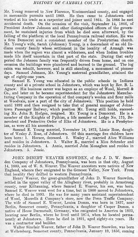 Mr. Young removed to New Florence, Westmoreland county, and engaged in mercantile pursuits until 1860. He then came to Johnstown and worked at his trade as a carpenter and joiner until 1864. In 1866 he met accidental death. On the occasion of the visit, September 14, 1866, of President Andrew Johnson and other distinguished officers of the government, he sustained injuries from which he died soon afterward, by the falling of the platform at the local Pennsylvania railroad station. He was a firm Democrat and a consistent member of the Presbyterian church. Mr. Young's wife, Sarah (Johnson) Young, is a descendant of an old Indiana county family whose settlement in the locality of Armagh was made when the region was almost a wilderness, and when Indian troubles made life itself uncertain in that part of the state. During that early period the Johnson family was frequently driven from home, and on one occasion the buildings were plundered and burned to the ground. The log cabin was rebuilt, however, and is still standing, a monument of pioneer days. Samuel Johnson, Mr. Young's maternal grandfather, attained the age of eighty-one years. Samuel E. Young was educated in the public schools in Indiana county and at a private school in Johnstown, which was kept by Rev. B. L. Agnew. His business career was begun as an employe of Wood, Morrell & Co., and later on he became superintendent for the Johnstown Manufacturing Company in the operation of that company's woolen and flour mills at Woodvale, now a part of the city of Johnstown. This position he held until 1892 and then resigned to take that of general manager of Johnstown Passenger Railway, which position Mr. Young still holds, succeeding Mr. John B. Hofgen, resigned. Mr. Young is a Democrat. He is a member of the Knights of Pythias, a life member of Lodge No. 175, Benevolent and Protective Order of Elks of Johnstown. He is a Presbyterian, as were all his ancestors. Samuel E. Young married, November 18, 1873, Lizzie Rose, daughter of Wesley J. Rose, of Johnstown. Of this marriage five children have been born: 1. Horace, deceased. 2. Wesley J., married Alice Williams and resides in Johnstown. 3. Walter R., married a Miss Schrader and resides in Johnstown. 4. Annie, married John Monaghen and resides in Johnstown. 5. Jessie.