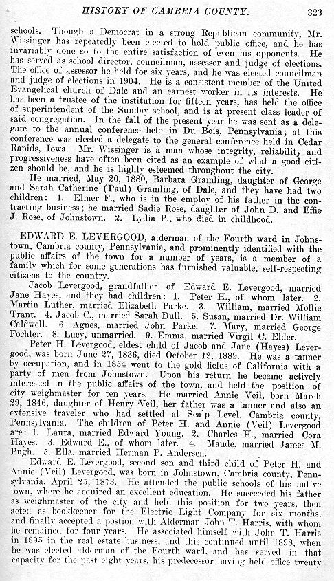 schools. Though a Democrat in a strong Republican community, Mr. Wissinger has repeatedly been elected to hold public office, and he has invariably done so to the entire satisfaction of even his opponents. He has served as school director, councilman, assessor and judge of elections. The office of assessor he held for six years, and he was elected councilman and judge of elections in 1904. He is a consistent member of the United Evangelical church of Dale and an earnest worker in its interests. He has been a trustee of the institution for fifteen years, has held the office of superintendent of the Sunday school, and is at present class leader of said congregation. In the fall of the present year he was sent as a delegate to the annual conference held in Du Bois, Pennsylvania; at this conference was elected a delegate to the general conference held in Cedar Rapids, Iowa. Mr. Wissinger is a man whose integrity, reliability and progressiveness have often been cited as an example of what a good citizen should be, and he is highly esteemed throughout the city. He married, May 20, 1880, Barbara Gramling, daughter of George and Sarah Catherine (Paul) Gramling, of Dale, and they have had two children: 1. Elmer F., who is in the employ of his father in the contracting business; he married Sadie Rose, daughter of John D. and Effie J. Rose, of Johnstown. 2. Lydia P., who died in childhood.