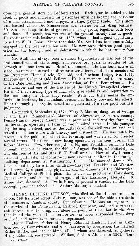 opening a general store on Bedford street. Each year he added to his stock of goods and increased his patronage until he became the possessor of a fine establishment and enjoyed a large, paying trade. This store was located where Dr. Zimmerman now carries on his drug business. Mr. Stull made specialties of groceries and dry goods, together with boots and shoes. His stock, however was of the general variety line of goods. He continued in this business until 1898, when he had a good opportunity to sell to W. R. Lohr. Since that date Mr. Stull has been successfully engaged in the real estate business. He now owns thirteen good properties in the borough and in Johnstown in which he has twenty-four tenants. Mr. Stull has always been a stanch Republican; he was one of the first councilmen of his borough and served two years as auditor of his borough and one term as clerk of the council. He has been active in school matters and served as director several terms. He is a member of the Protective Home Circle, No. 138, and Moxham Lodge, No. 1044, Independent Order of Odd Fellows. He is a member and the secretary of the Dale Building and Loan Association, of Dale, Pennsylvania. He is a member and one of the trustees of the United Evangelical church. He is of that stirring type of men who give stability and reputation to the community in which they reside. With but little means he embarked in business, but abundant success has finally crowned his efforts. He is thoroughly energetic, honest and possessed of a rare good business judgment. He married, September 8, 1874, Mary J. Maurer, daughter of George J. and Eliza (Zimmerman) Maurer, of Stoyestown, Somerset county, Pennsylvania. George Maurer was a prominent and wealthy farmer of his township, operating a farm of two, hundred acres. In his younger days he taught school, and at the outbreak of the civil war enlisted and served the Union cause with bravery and distinction. He was much interested in the public schools of his township and was its school director several terms. His farm is now being operated by his sons, Josiah and Robert Maurer. Two other sons, John H., and Franklin, reside in Dale borough, and one daughter, the wife of August Perlin, of Philadelphia. The children of Mr. and Mrs. B. F. Stull are: 1. Howard W., formerly assistant postmaster at Johnstown, now assistant auditor in the foreign auditing department at Washington, D. C. He married Jennie McGaghan and they have three children--Margaret, Franklin and Webster. 2. George B., a practicing physician and an alumnus of the Chirurgical Medical College of Philadelphia. He is now in practice at Harrisburg, Pennsylvania, and is assistant surgeon of the Harrisburg Hospital. 3. Annie May, deceased. 4. Ivella Pearl, at present a teacher in the Dale borough grammar school. 5. Arthur Maurer, a student.