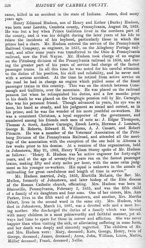rance, killed in an accident in the state of Indiana. James, died many years ago. Henry Edmund Hudson, son of Henry and Esther (Burke) Hudson, was born near Loretto, Cambria county, Pennsylvania, August 28, 1823. He was but a boy when Prince Gallitzin lived in the northern part of the county, and it was his delight during the later years of his life to relate the incidents of his boyhood, particularly those in which the prince had a share. Mr. Hudson entered the service of the Pennsylvania Railroad Company, as engineer, in 1852, on the Allegheny Portage railroad, and after some years was transferred to the Ohio & Pennsylvania railroad, now the Fort Wayne. Mr. Hudson took charge of an engine on the Pittsburg division of the Pennsylvania railroad in 1858, and during the greater part of his years of service had charge of the fastest passenger trains. In all this time he was noted for his careful attention to the duties of his position, his skill and reliability, and he never met with a serious accident. At the time he retired from active service on the road he had in charge an engine which pulled some of the finest passenger trains in this country. This was on the stretch between Conemaugh and Gallitzin, over the mountain. He was placed on the railroad pension list when he relinquished his duties, and a few months prior to his death he was placed on the Carnegie pension roll by Mr. Carnegie, who was his personal friend. Though advanced in years, his eye was as keen, his hand as steady, and his judgment as sound and correct, as in his prime, and he was the wonder of his more youthful co-workers. He was a consistent Christian, a loyal supporter of the government, and numbered among his friends such men of note as: J. Edgar Thompson, Thomas A. Scott, Andrew Carnegie, Enoch Lewis, Herman J. Lombart, George B. Roberts, Edward H. Williams, A. J. Cassatt, and Robert Pitcairn. He was a member of the Veterans' Association of the Pittsburg Division of the Pennsylvania Railroad, and attended all the meetings of the association with the exception of the one held in Altoona a few weeks prior to his demise. At a reunion of this organization, held in Johnstown, May 21, 1903, Henry Wilson Storey spoke of Mr. Hudson as follows: "Henry E. Hudson was an active engineer for forty-eight years, and at the age of seventy-five years ran on the fastest passenger trains, making fifty and sixty miles per hour, with the same calm judgment as his younger co-workers. His equal is unknown in the annals of railroading for great carefulness and length of time in service." Mr. Hudson married, July, 1853, Murtilla McLain, the Rev. Mr. Mullen, formerly of Johnstown, and later bishop of the Erie diocese of the Roman Catholic church, officiating. Mrs. Hudson was born in Blairsville, Pennsylvania, February 2, 1833, and was the fifth child of a family of six daughters and four sons. One of her sisters, Mrs. Ann Parker, lives in the fifth ward of Johnstown, and another, Mrs. Martha Dibert, lives in the second ward in the same city. Mrs. Hudson, who died in Johnstown, March 14, 1887, was a devoted wife and a most loving mother. She discharged the duties of a family which was blessed with many children in a most praiseworthy and faithful manner, yet always had time to spare for those in sorrow and affliction. She was never happier than when visiting the sick, or alleviating suffering in some form, and her death was deeply and sincerely regretted. The children of Mr. and Mrs. Hudson were: Mary, deceased; Kate, George, Henry, twin of George, deceased; James, deceased; Anna., John, William, Lizzie, Mattie, Millie, deceased; Frank, deceased; Nellie. |