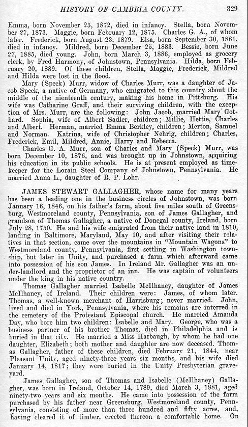 JAMES STEWART GALLAGHER, whose name for many years has been a leading one in the business circles of Johnstown, was born January 16, 1846, on his father's farm, about five miles south of Greensburg, Westmoreland county, Pennsylvania, son of James Gallagher, and grandson of Thomas Gallagher, a native of Donegal county, Ireland, born July 28, 1750. He and his wife emigrated from their native land in 1810, landing in Baltimore, Maryland, May 10, and after visiting their relatives in that section, came over the mountains in "Mountain Wagons" to Westmoreland county, Pennsylvania, first settling in Washington township, but later in Unity, and purchased a farm which afterward came into possession of his son James. In Ireland Mr. Gallagher was an under-landlord and the proprietor of an inn. He was captain of volunteers under the king in his native country. |
