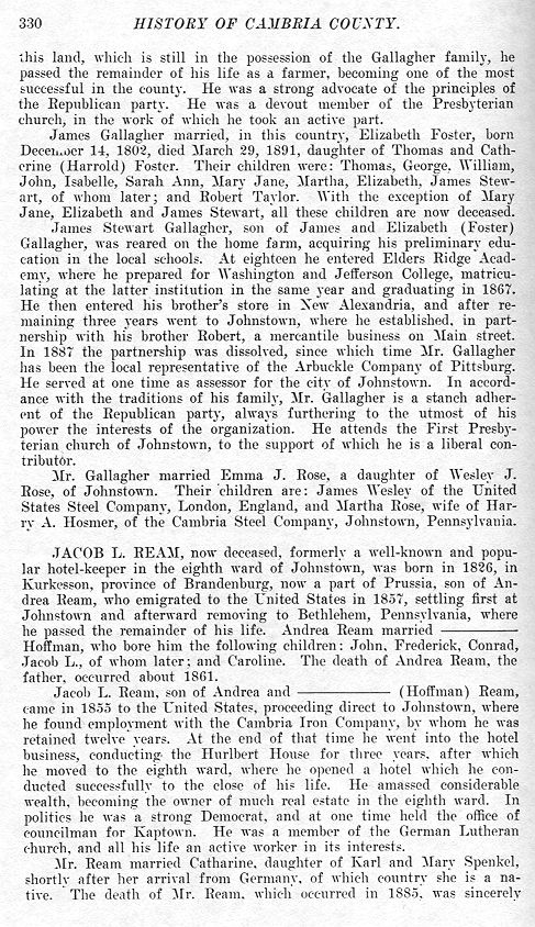 his land, which is still in the possession of the Gallagher family, he passed the remainder of his life as a farmer, becoming one of the most successful in the county. He was a strong advocate of the principles of the Republican party. He was a devout member of the Presbyterian church, in the work of which he took ail active part. James Gallagher married, in this country, Elizabeth Foster, born December 14, 1802, died March 29, 1891, daughter of Thomas and Catherine (Harrold) Foster. Their children were: Thomas, George, William, John, Isabelle, Sarah Ann, Mary Jane, Martha, Elizabeth, James Stewart, of whom later; and Robert Taylor. With the exception of Mary Jane, Elizabeth and James Stewart, all these children are now deceased. James Stewart Gallagher, son of James and Elizabeth (Foster) Gallagher, was reared on the home farm, acquiring his preliminary education in the local schools. At eighteen he entered Elders Ridge Academy, where he prepared for Washington and Jefferson College, matriculating at the latter institution in the same year and graduating in 1867. He then entered his brother's store in New Alexandria, and after remaining three years went to Johnstown, where he established, in partnership with his brother Robert, a mercantile business on Main street. In 1887 the partnership was dissolved, since which time Mr. Gallagher has been the local representative of the Arbuckle Company of Pittsburg. He served at one time as assessor for the city of Johnstown. In accordance with the traditions of his family, Mr. Gallagher is a stanch adherent of the Republican party, always furthering to the utmost of his power the interests of the organization. He attends the First Presbyterian church of Johnstown, to the support of which he is a liberal contributor. Mr. Gallagher married Emma J. Rose, a daughter of Wesley J. Rose, of Johnstown. Their children are: James Wesley of the United States Steel Company, London, England, and Martha Rose, wife of Harry A. Hosmer, of the Cambria Steel Company, Johnstown, Pennsylvania.