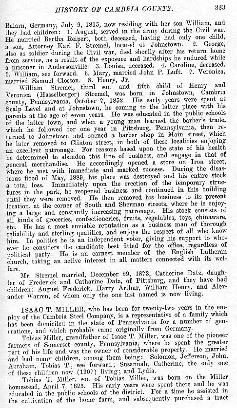 Baian, Germany; July 9, 1815, now residing with her son William, and they had children: 1. August, served in the army during the Civil war. He married Bertha Reipert, both deceased, having had only one child, a son, Attorney Karl F. Stremel, located at Johnstown. 2. George, also as soldier during the Civil war, died shortly after his return home from service, as a result of the exposure and hardships he endured while a prisoner in Andersonville. 3. Louisa, deceased. 4. Caroline, deceased. 5. William, see forward. 6. Mary, married John P. Luft. 7. Veronica, married Samuel Closson. 8. Henry, Jr. William Stremel, third son and fifth child of Henry and Veronica (Hasselberger) Stremel, was born in Johnstown, Cambria county, Pennsylvania, October 7, 1852. His early years were spent at Scalp Level and at Johnstown, he coming to the latter place with his parents at the age of seven years. He was educated in the public schools of the latter town, and when a young man learned the barber's trade, which he followed for one year in Pittsburg, Pennsylvania, then returned to Johnstown and opened a barber shop in Main street, which he later removed to Clinton street, in both of these localities enjoying an excellent patronage. For reasons based upon the state of his health he determined to abandon this line of business, and engage in that of general merchandise. He accordingly opened a store on Iron street, where he met with immediate and marked success. During the disastrous flood of May, 1889, his place was destroyed and his entire stock a total loss. Immediately upon the erection of the temporary structures in the park, he reopened business and continued in this building until they were removed. He then removed his business to its present location, at the corner of South and Sherman streets, where he is enjoying a large and constantly increasing patronage. His stock consists of all kinds of groceries, confectioneries, fruits, vegetables, toys, chinaware, etc. He has a most enviable reputation as a business man of thorough reliability and sterling qualities, and enjoys the respect of all who know him. In politics he is an independent voter, giving his support to whoever he considers the candidate best fitted for the office, regardless of political party. He is an earnest member of the English Lutheran church, taking an active interest in all matters connected with its welfare. Mr. Stremel married, December 29, 1873, Catherine Datz, daughter of Frederick and Catharine Datz, of Pittsburg, and they have had children: August Frederick, Harry Arthur, William Henry, and Alexander Warren, of whom only the one last named is now living.