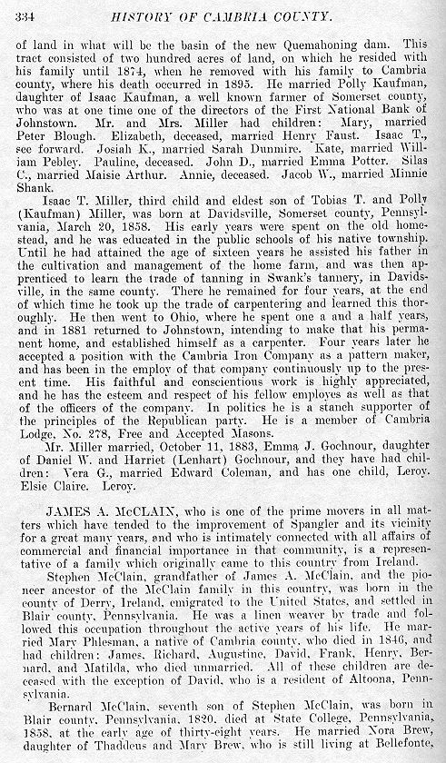 of land in what will be the basin of the new Quemahoning dam. This tract consisted of two hundred acres of land, on which he resided with his family until 1874, when he removed with his family to Cambria county, where his death occurred in 1895. He married Polly Kaufman, daughter of Isaac Kaufman, a well known farmer of Somerset county, who was at one time one of the directors of the First National Bank of Johnstown. Mr. and Mrs. Miller had children: Mary, married Peter Blough. Elizabeth, deceased, married Henry Faust. Isaac T., see forward. Josiah K., married Sarah Dunmire. Henry married William Pebley. Pauline, deceased. John D., married Emma Potter. Silas C., married Maisie Arthur. Annie, deceased. Jacob W., married Minnie Shank. Isaac T. Miller, third child and eldest son of Tobias T. and Polly (Kaufman) Miller, was born at Davidsville, Somerset county, Pennsylvania, March 20, 1858. His early years were spent on the old homestead, and he was educated in the public schools of his native township. Until he had attained the age of sixteen years he assisted his father in the cultivation and management of the home farm, and was then apprenticed to learn the trade of tanning in Swank's tannery, in Davidsville, in the same county. There he remained for four years, at the end of which time he took up the trade of carpentering and learned this thoroughly. He then went to Ohio, where he spent one a and a half years, and in 1881 returned to Johnstown, intending to make that his permanent home, and established himself as a carpenter. Four years later he accepted a position with the Cambria Iron Company as a pattern maker, and has been in the employ of that company continuously up to the present time. His faithful and conscientious work is highly appreciated, and he has the esteem and respect of his fellow employes as well as that of the officers of the company. In politics he is a stanch supporter of the principles of the Republican party. He is a member of Cambria Lodge, No. 278, Free and Accepted Masons. Mr. Miller married, October 11, 1883, Emma J. Gochnour, daughter of Daniel W. and Harriet (Lenhart) Gochnour, and they have had children; Vera G., married Edward Coleman, and has one child, Leroy. Elsie Claire. Leroy.