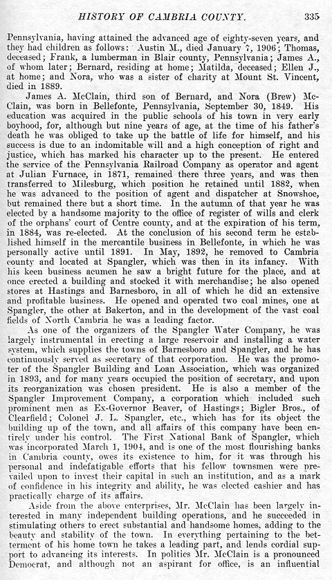 Pennsylvania, having attained the advanced age of eighty-seen years, and they had children as follows: Austin M., died January 7, 1906; Thomas, deceased; Frank, a lumberman in Blair county, Pennsylvania; James A., of whom later; Bernard, residing at home; Matilda, deceased; Ellen J., at home; and Nora, who was a sister of charity at Mount St. Vincent, died in 1889. James A. McClain, third son of Bernard, and Nora (Brew) McClain, was born in Bellefonte, Pennsylvania, September 30, 1849. His education was acquired in the public schools of his town in very early boyhood, for, although but nine years of age, at the time of his father's death he was obliged to take up the battle of life for himself, and his success is due to an indomitable will and a high conception of right and justice, which has marked his character up to the present. He entered the service of the Pennsylvania Railroad Company as operator and agent at Julian Furnace, in 1871, remained there three years, and was then transferred to Milesburg, which position he retained until 1882, when he was advanced to the position of agent and dispatcher at Snowshoe, but remained there but a short time. In the autumn of that year he was elected by a handsome majority to the office of register of wills and clerk of the orphans' court of Centre county, and at the expiration of his term, in 1884, was re-elected. At the conclusion of his second term he established himself in the mercantile business in Bellefonte, in which he was personally active until 1891. In May, 1892, he removed to Cambria county and located at Spangler, which was then in its infancy. With his keen business acumen he saw a bright future for the place, and at once erected a building and stocked it with merchandise; he also opened stores at Hastings and Barnesboro, in all of which he did an extensive and profitable business. He opened and operated two coal mines, one at Spangler, the other at Bakerton, and in the development of the vast coal fields of North Cambria he was a leading factor. As one of the organizers of the Spangler Water Company, he was largely instrumental in erecting a large reservoir and installing a water system, which supplies the towns of Barnesboro and Spangler, and he has continuously served as secretary of that corporation. He was the promoter of the Spangler Building and Loan Association, which was organized in 1893, and for many years occupied the position of secretary, and upon its reorganization was chosen president. He is also a member of the Spangler Improvement Company, a corporation which included such prominent men as Ex-Governor Beaver, of Hastings; Bigler Bros., of Clearfield; Colonel J. L. Spangler, etc., which has for its object the building up of the town, and all affairs of this company have been entirely under his control. The First National Bank of Spangler, which was incorporated March 1, 1901, and is one of the most flourishing banks in Cambria county, owes its existence to him, for it was through his personal and indefatigable efforts that his fellow townsmen were prevailed upon to invest their capital in such an institution, and as a mark of confidence in his integrity and ability, he was elected cashier and has practically charge of its affairs. Aside from the above enterprises, Mr. McClain has been largely interested in many independent building operations, and he succeeded in stimulating others to erect substantial and handsome homes, adding to the beauty and stability of the town. In everything pertaining to the betterment of his home town he takes a leading part, and lends cordial support to advancing its interests. In politics Mr. McClain is a pronounced Democrat, and although not an aspirant for office, is an influential |