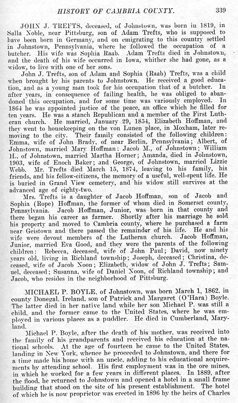 JOHN J. TREFTS, deceased, of Johnstown, was born in 1819, in Salla Noble, near Pittsburg, son of Adam Trefts, who is supposed to have been born in Germany, and on emigrating to this country settled in Johnstown, Pennsylvania, where he followed the occupation of a butcher. His wife was Sophia Raab. Adam Treats died in Johnstown, and the death of his wife occurred in Iowa, whither she had gone, as a widow, to live with one of her sons. John J. Trefts, son of Adam and Sophia (Raab) Trefts, was a child when brought by his parents to Johnstown. He received a good education, and as a young man took for his occupation that of a butcher. In after years, in consequence of failing health, he was obliged to abandoned this occupation, and for some time was variously employed. In 1864 he was appointed justice of the peace, an office which he filled for ten years. He was a stanch Republican and a member of the First Lutheran church. He married, January 29, 1854, Elizabeth Hoffman, and they went to housekeeping on the von Lunen place, in Moxham, later removing to the city. Their family consisted of the following children: Emma, wife of John Brady, of near Berlin, Pennsylvania; Albert, of Johnstown, married Mary Hoffman. Jacob M., of Johnstown; William H. of Johnstown, married Martha Horner; Amanda, died in Johnstown, 1903, wife of Enoch Baker; and George, of Johnstown, married Lizzie Webb. Mr. Trefts died March 16, 1874, leaving to his family, his friends, and his fellow-citizens, the memory of a useful, well-spent life. He is buried in Grand View cemetery, and his widow still survives at the advanced age of eighty-two. Mrs. Trefts is a daughter of Jacob Hoffman, son of Jacob and Sophia (Rope) Hoffman, the former of whom died in Somerset county, Pennsylvania. Jacob Hoffman, Junior, was born in that county and there began his career as farmer. Shortly after his marriage he sold his property and moved to Cambria county, where he purchased a farm near Geistown and there passed the remainder of his life. He and his wife were devout members of the Lutheran church. Jacob Hoffman, Junior, married Eva Good, and they were the parents of the following children: Rebecca, deceased, wife of John Paul; David, now ninety years old, living in Richland township; Joseph, deceased; Christina, deceased, wife of Jacob Noon; Elizabeth, widow of John J. Trefts; Samuel, deceased, Susanna, wife of Daniel Noon, of Richland township; and Jacob, who resides in the neighborhood of Pittsburg.